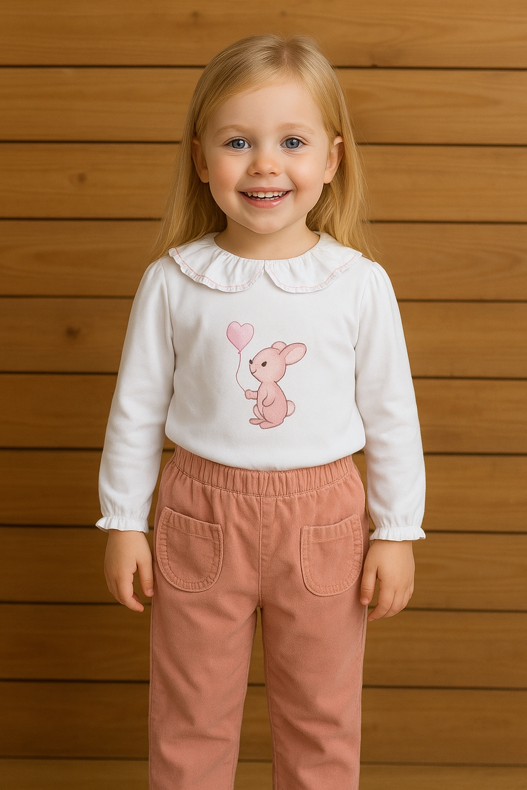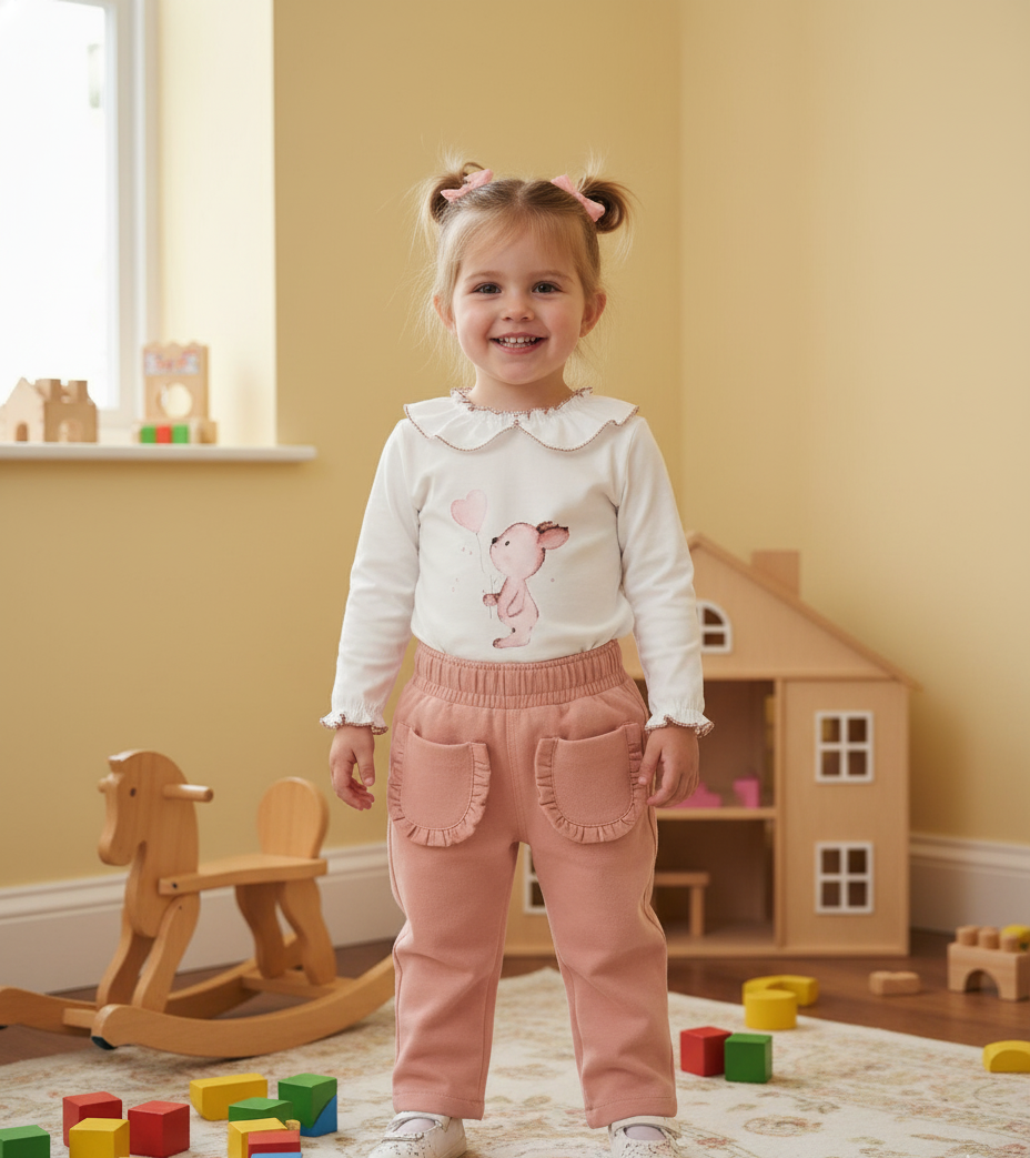 El conjunto infantil de camiseta y pantalón de algodón color rosa nude con un diseño clásico con estampado de conejito con globo de corazón y volante en el cuerpo con remate en rosa en el filo del volante, confeccionado en un material suave y cálido.