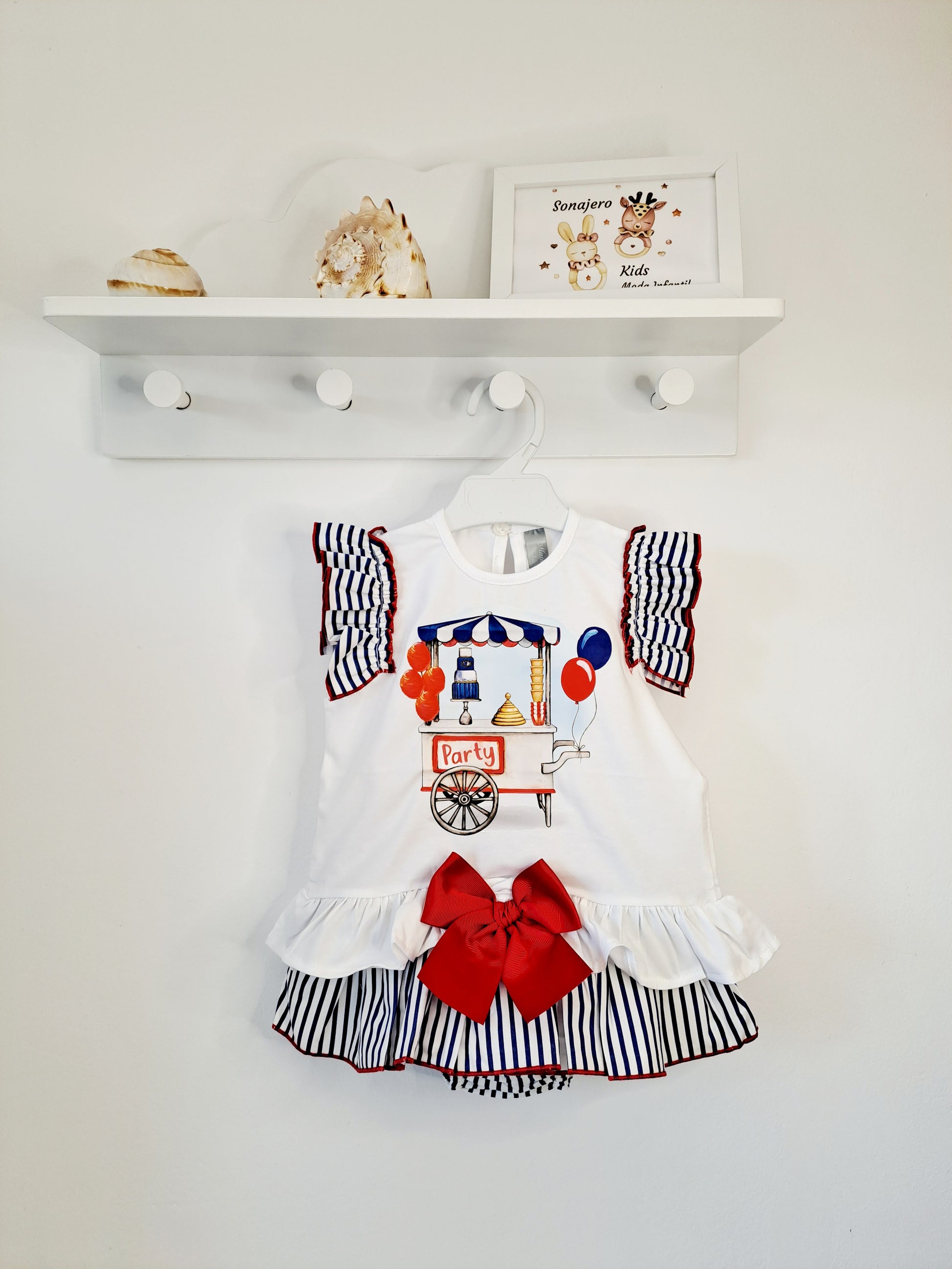 Conjunto de camiseta con volante en los hombros y braguita a rayas marino y lazo rojo.