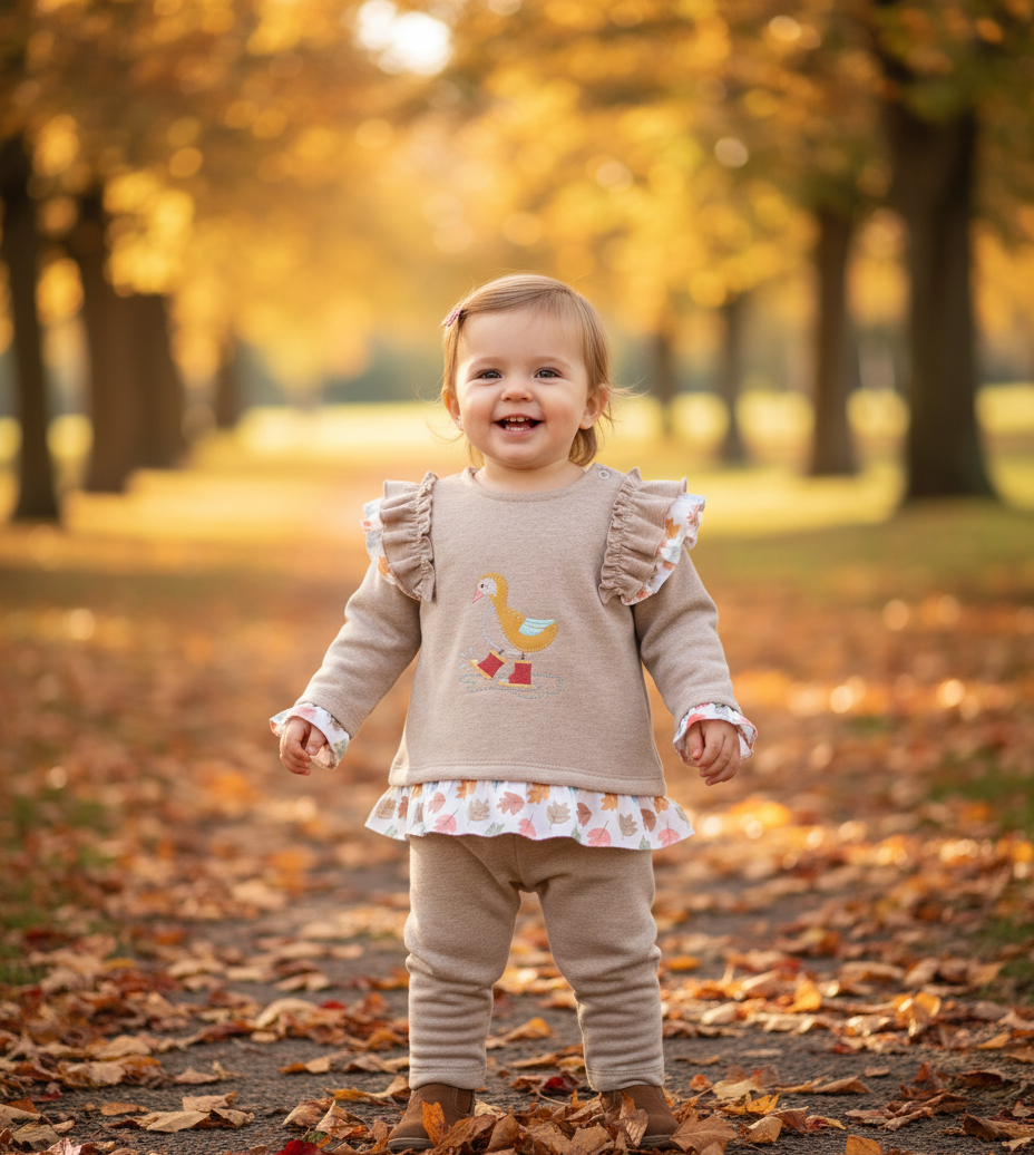 Conjunto tierno y cómodo para bebé, ideal para el otoño. Incluye blusa manga larga con volantes y estampado de pato con botas, más pantalones a juego.