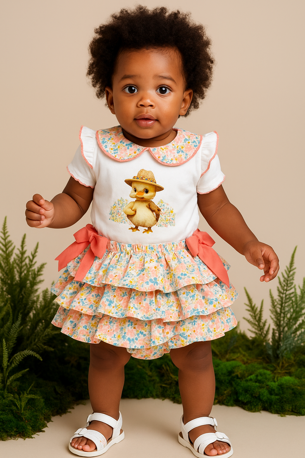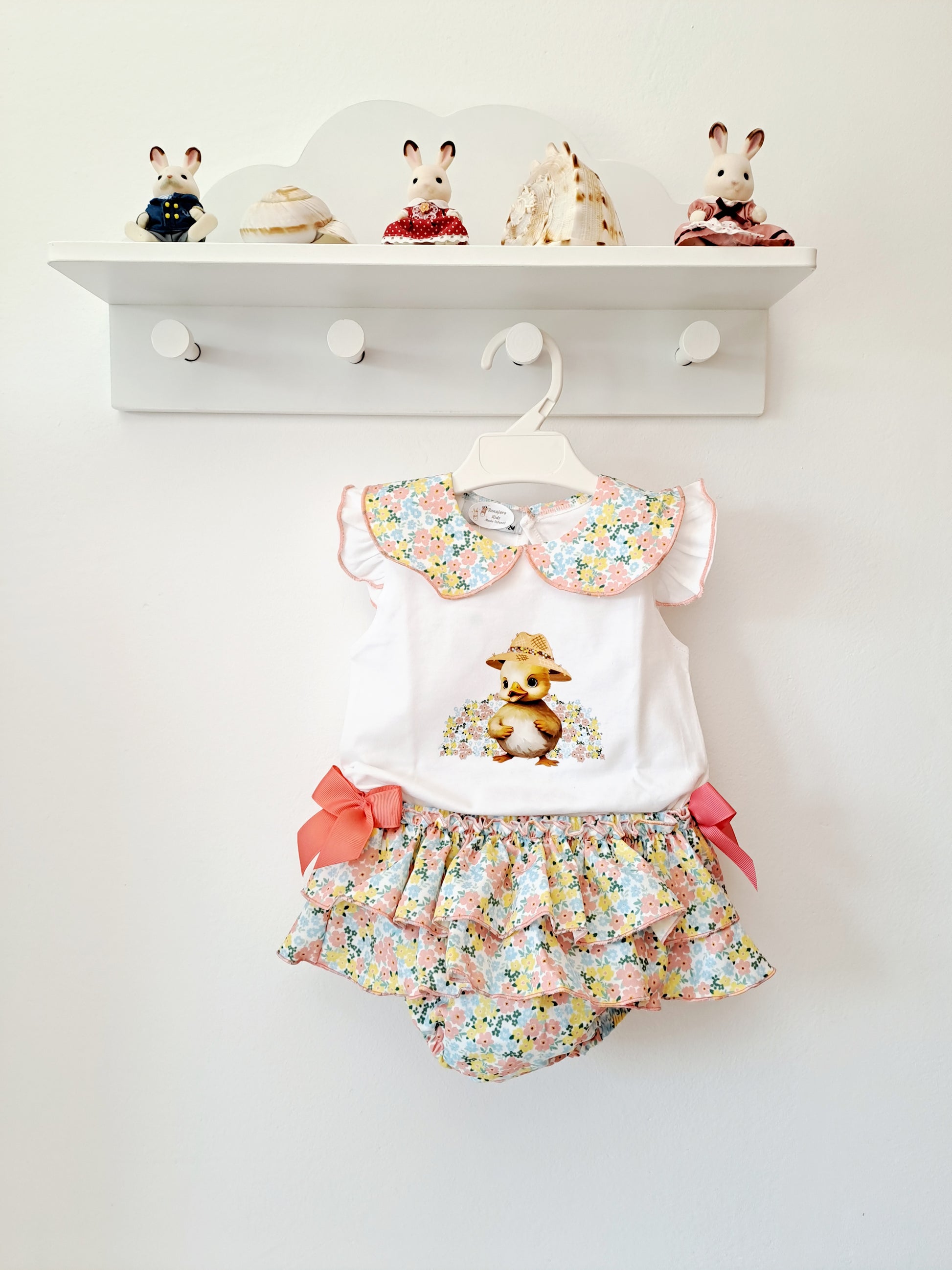 Conjunto camiseta de algodón con detalle en el cuello y braguita de dos volantes con lacitos a los lados.