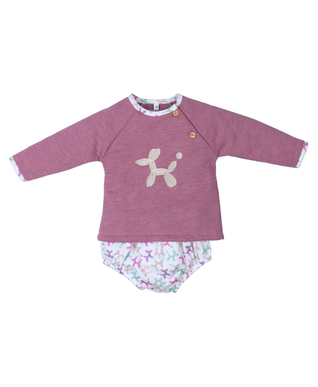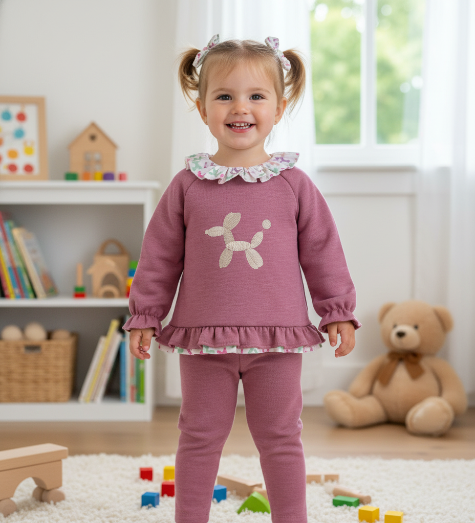 Este adorable conjunto para bebé de dos piezas en tono rosa antiguo combina comodidad y elegancia con un toque romántico. La blusa de manga larga presenta un encantador cuello babero con estampado floral en tonos suaves, adornado con un delicado volante que aporta un aire vintage y femenino. El detalle de volantes en el bajo de la blusa y en los puños añade un toque juguetón y dulce. El pantalón a juego, confeccionado en el mismo tejido suave y elástico, ofrece libertad de movimiento y confort. Cierre trasero con broches a presión para facilitar el cambio. Ideal para ocasiones especiales o para un día lleno de ternura