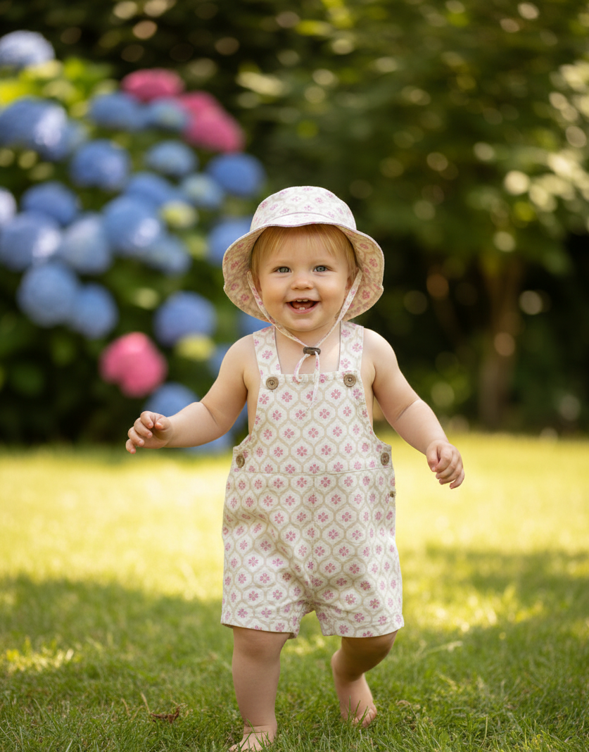 Gorro a Juego: Incluye un gorro tipo "bucket hat" o capota de sol con el mismo estampado, diseñado con un ala ancha para proteger la cara del sol, manteniendo la armonía visual de todo el look.