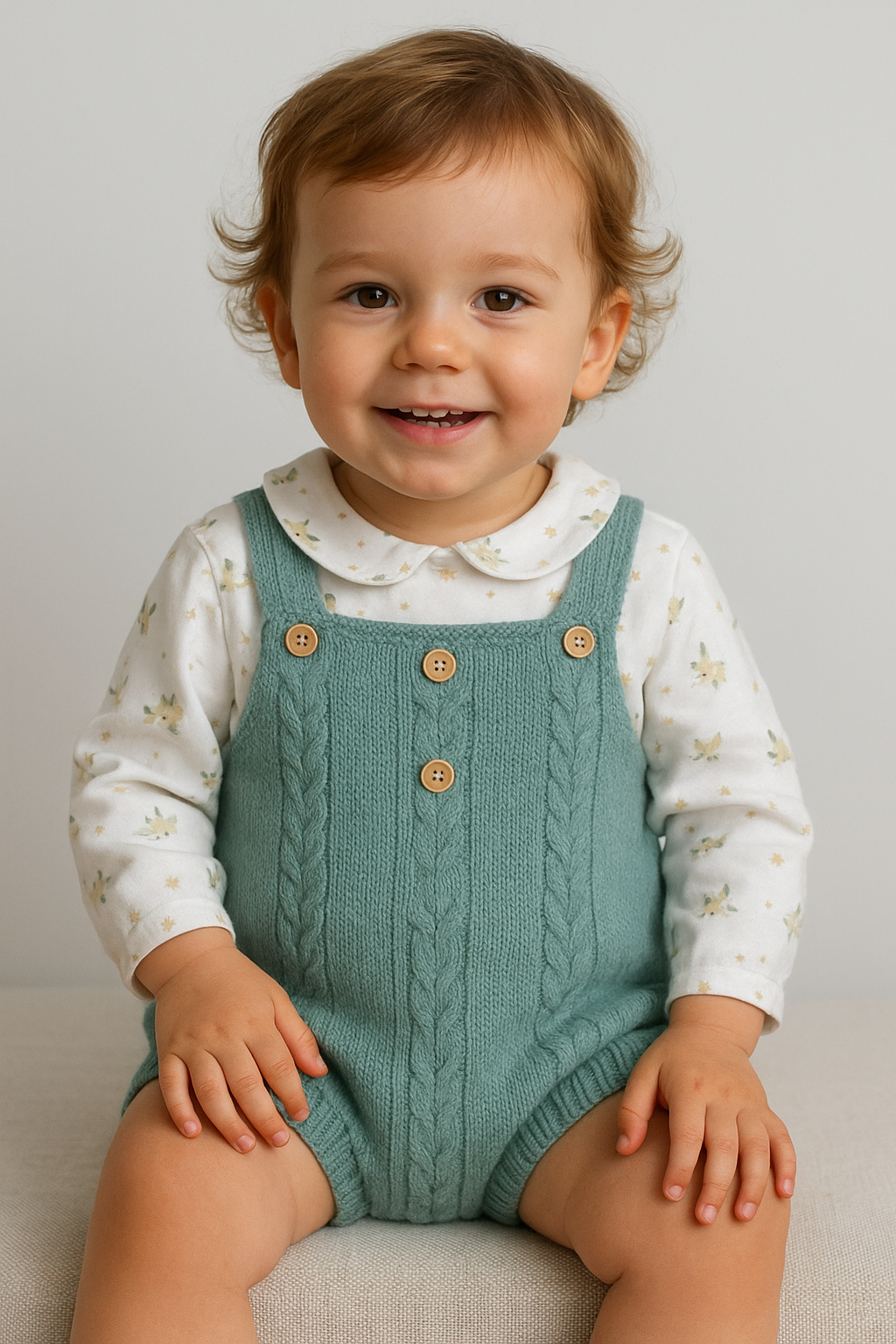 🌿Conjunto para bebé compuesto por un peto de punto en suave lana color verde agua y una camisa de manga larga con estampado dulce de animalitos y estrellas. El peto tiene un diseño trenzado en la parte delantera y botones de madera para un toque clásico y elegante. La camisa presenta cuello redondo con volante y cierre trasero para facilitar el cambio. Ideal para mantener a tu bebé cómodo y abrigado con estilo..🌿