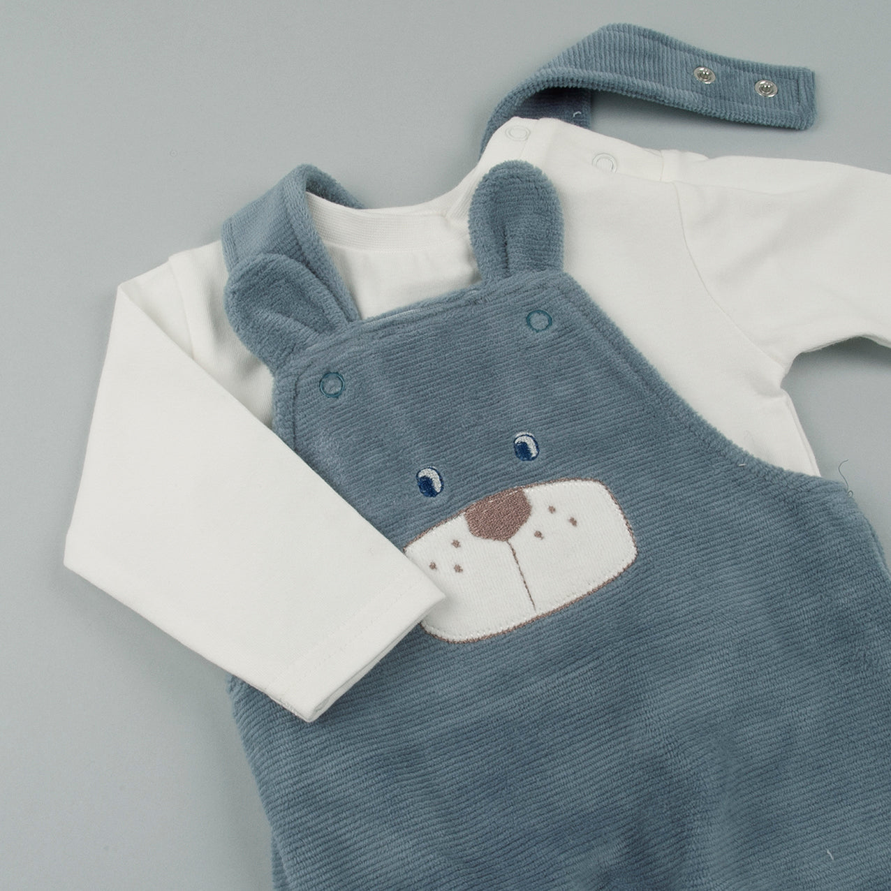 Conjunto de peto de micropana con dibujo de carita oso y camiseta crema