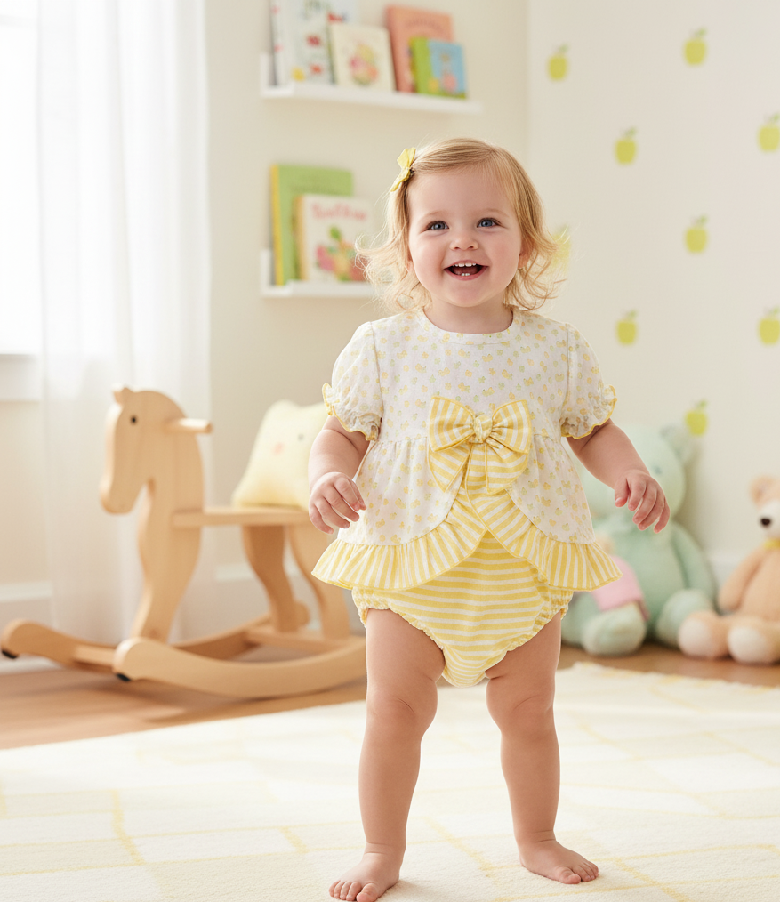 💛Conjunto pololo algodón Blusa con estampado de frutas apertura con lazo y volante de rallas y braguita de rallas.💛