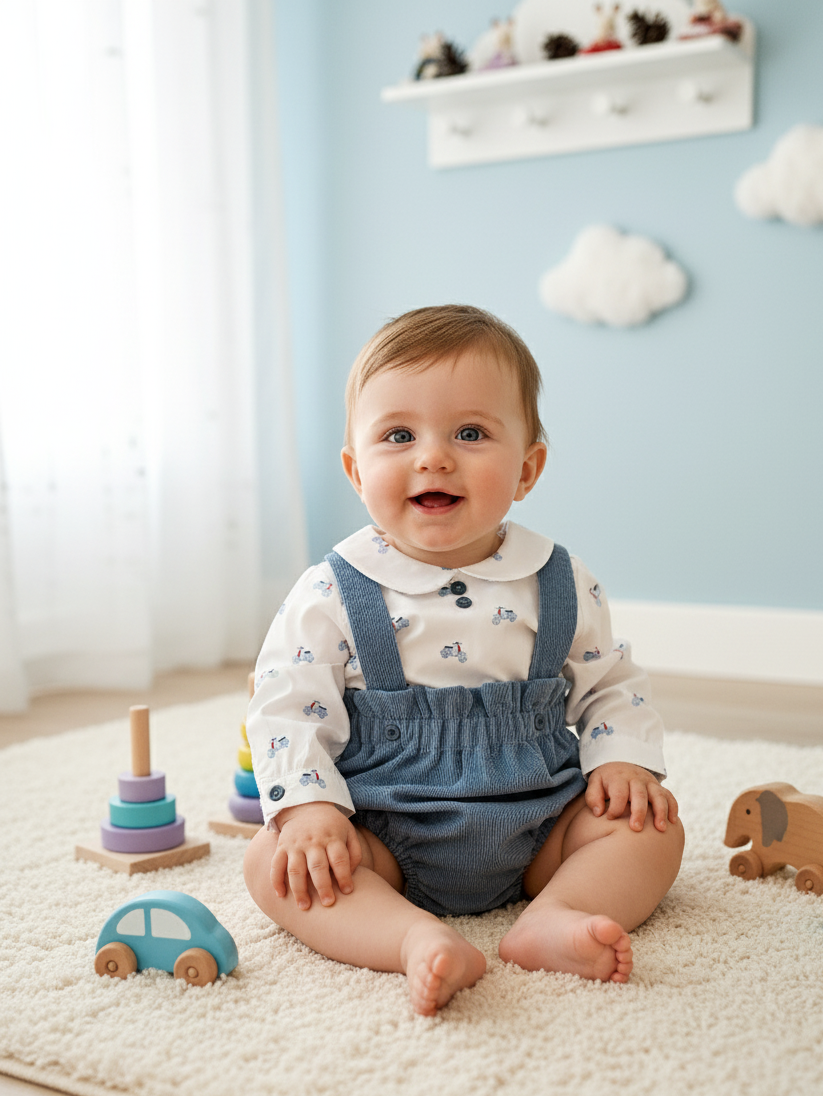 El conjunto infantil incluye un pololo con tirantes de color azul y camisa blanca con temática de motitos, confeccionado en un material suave y cálido. Tiene botones en la tapeta para facilitar su colocación, lo que le da un toque natural y acogedor.