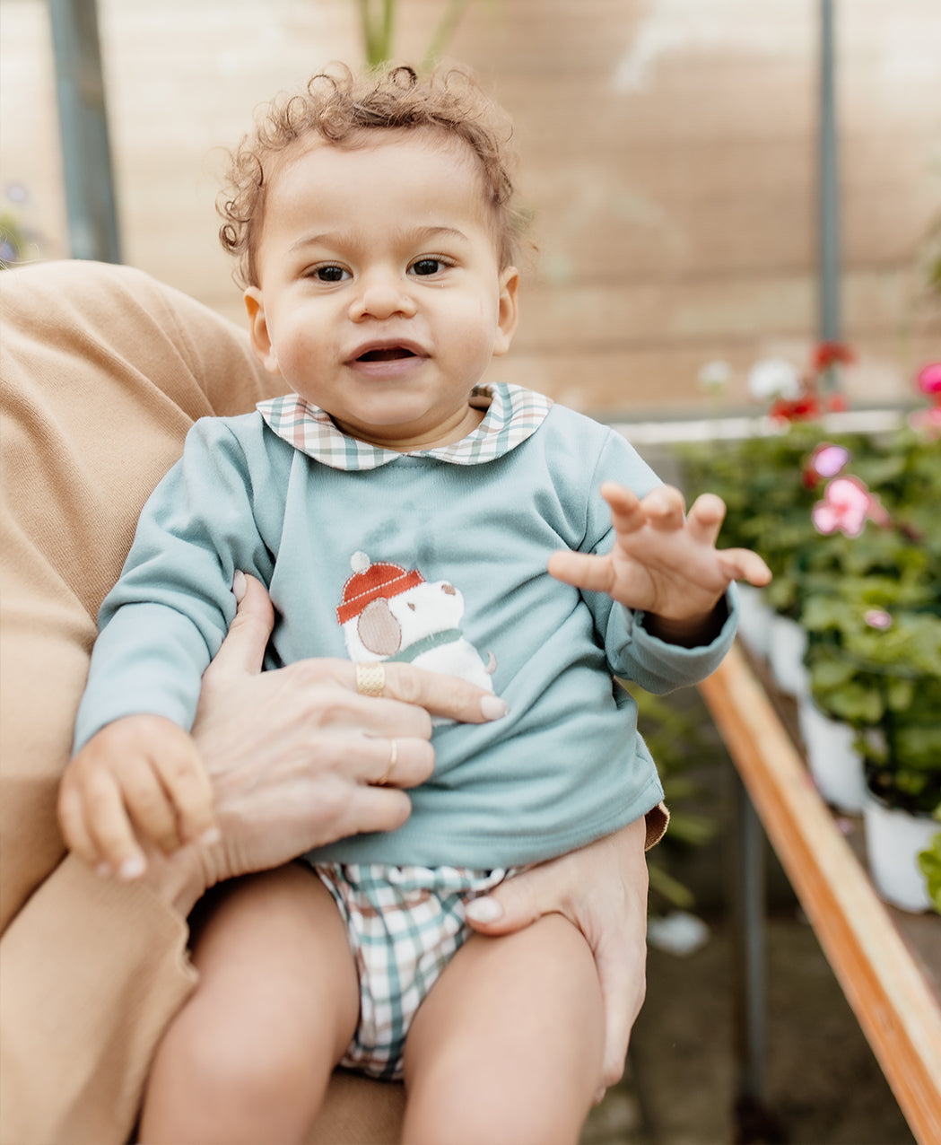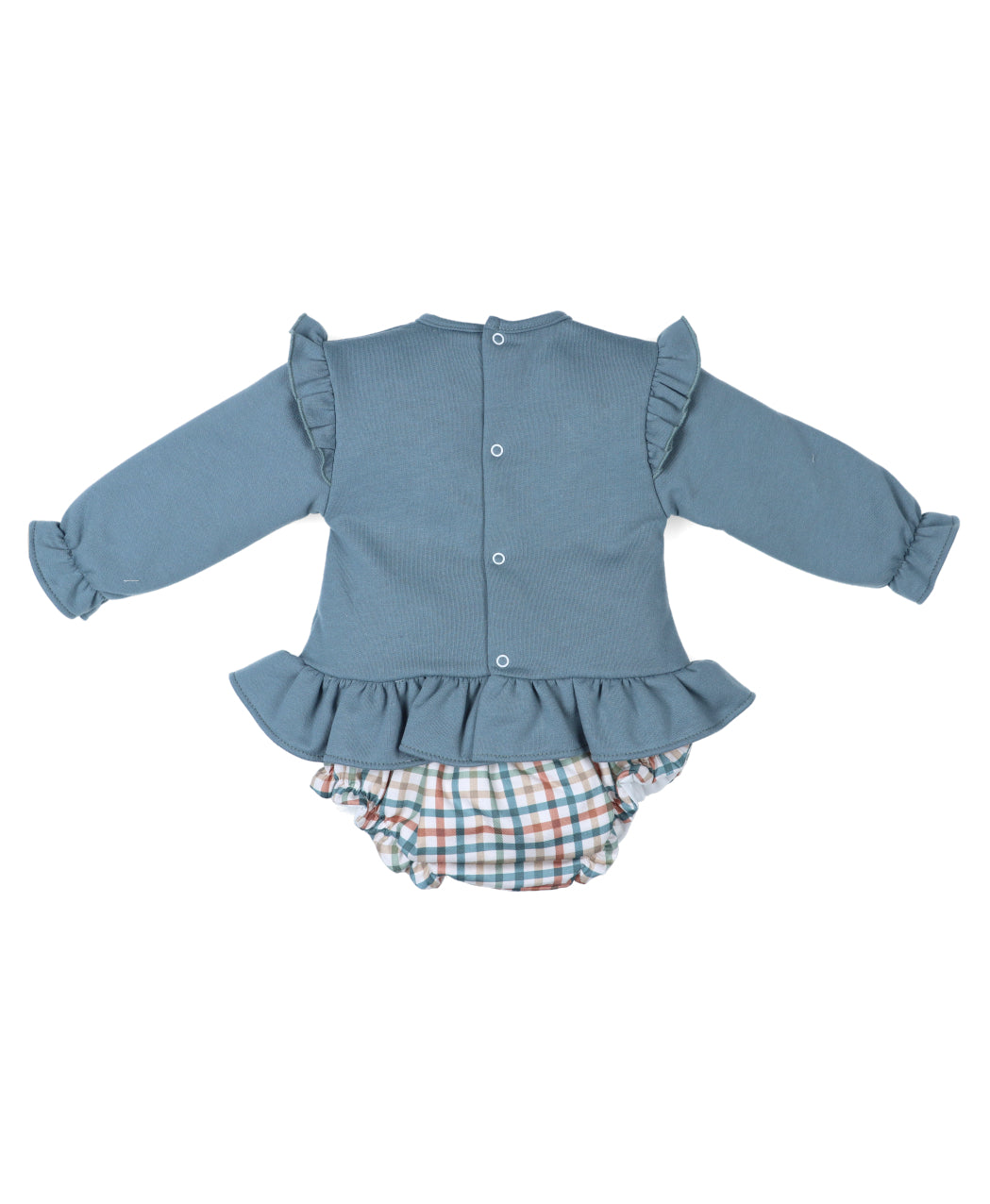 Conjunto pololo para niña con blusa de punto azul grisáceo, detalles de volantes y flores aplicadas en el frente. Cierre trasero con broches. Pololo de cuadros a juego con cintura y piernas elásticas. Suave, cómodo y adorable para cualquier ocasión.