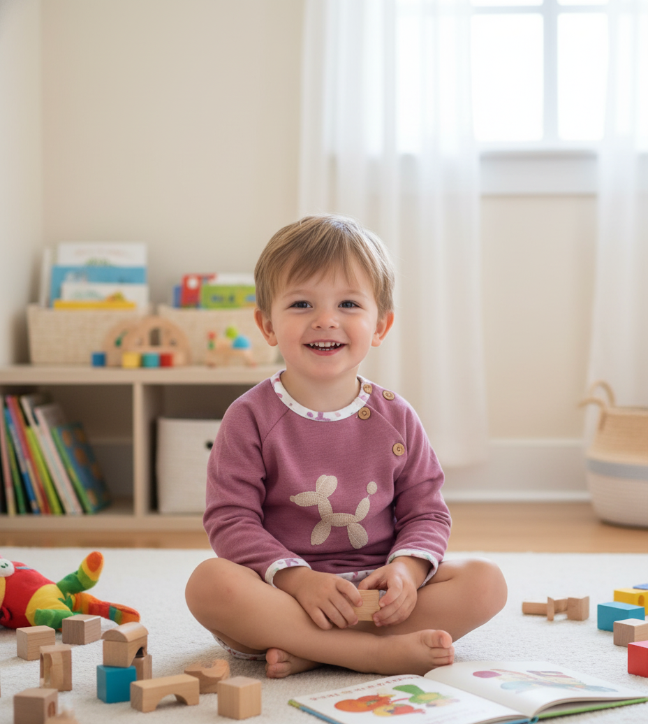 Suéter de manga larga en un tono rosa vino jaspeado, confeccionado en una tela suave y cálida. El diseño incluye un simpático bordado de un perrito en forma de globo en el centro del pecho, lo que le da un toque lúdico y encantador. Tiene un cuello redondo con detalles de tela estampada y dos botones decorativos/muy funcionales en el hombro para facilitar el cambio de ropa.