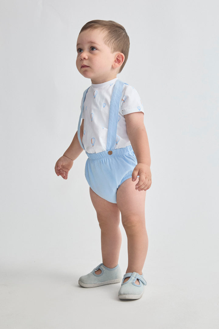 💚Conjunto de dos piezas para bebé niño de 3 meses a 6 años. Camiseta blanca con estampado de globos aerostáticos en tonos celeste y naranja, con cierre trasero de botones para mayor comodidad. Braguita celeste con tirantes cruzados y botones decorativos en madera.