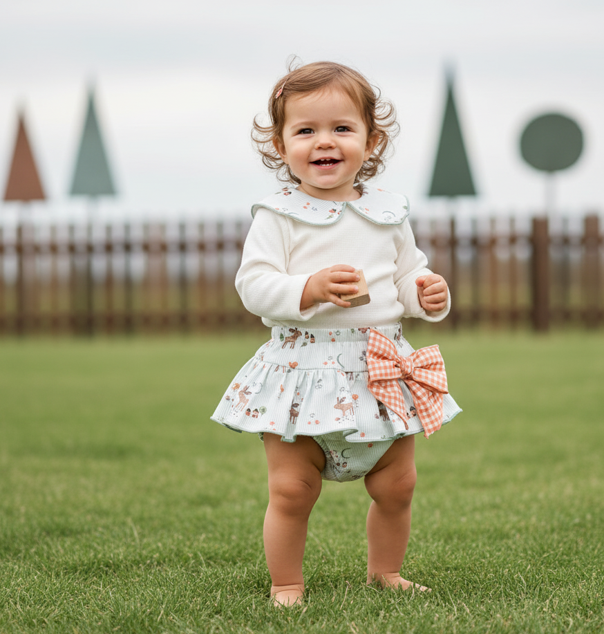 Conjunto pololo Blanco con volante en cuello y braguita con lazo vichy naranja