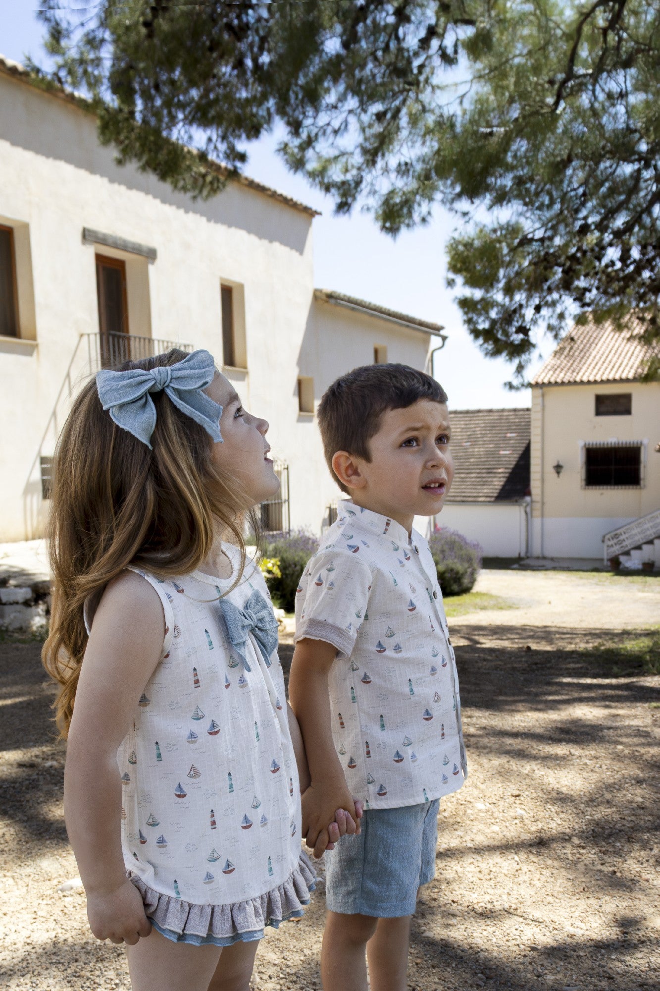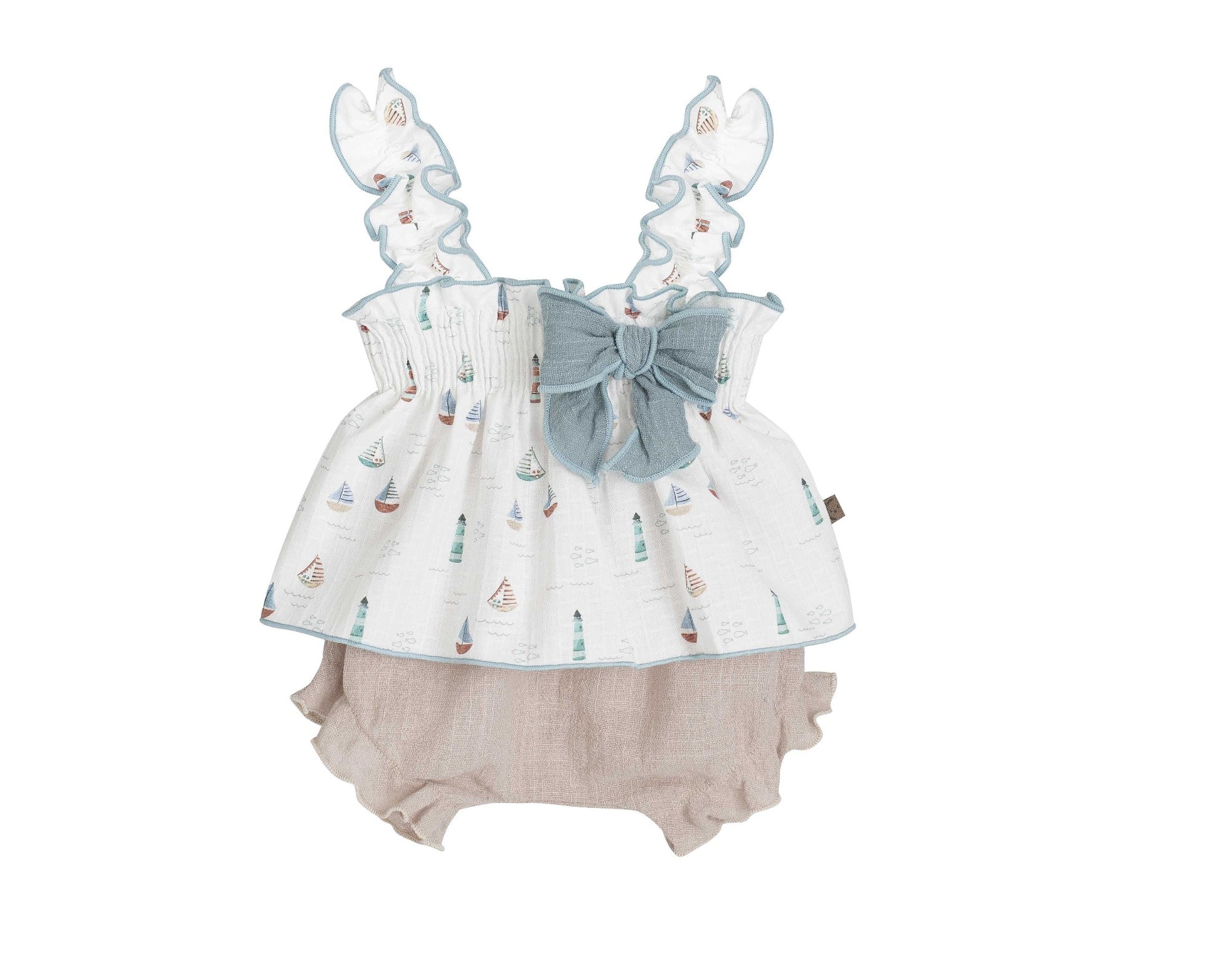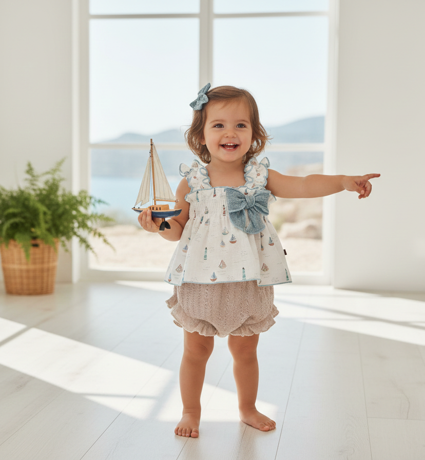 Haz que cada día se sienta como una aventura junto al mar. Este encantador conjunto de dos piezas combina un top de tirantes con volantes y un delicado estampado náutico de barquitos, realzado por un gran lazo de denim suave en el pecho.