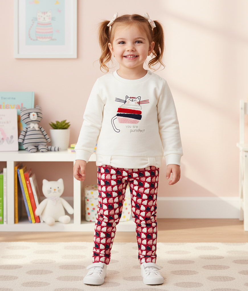 Conjunto de sudadera blanca y pantalón con gatitos.
