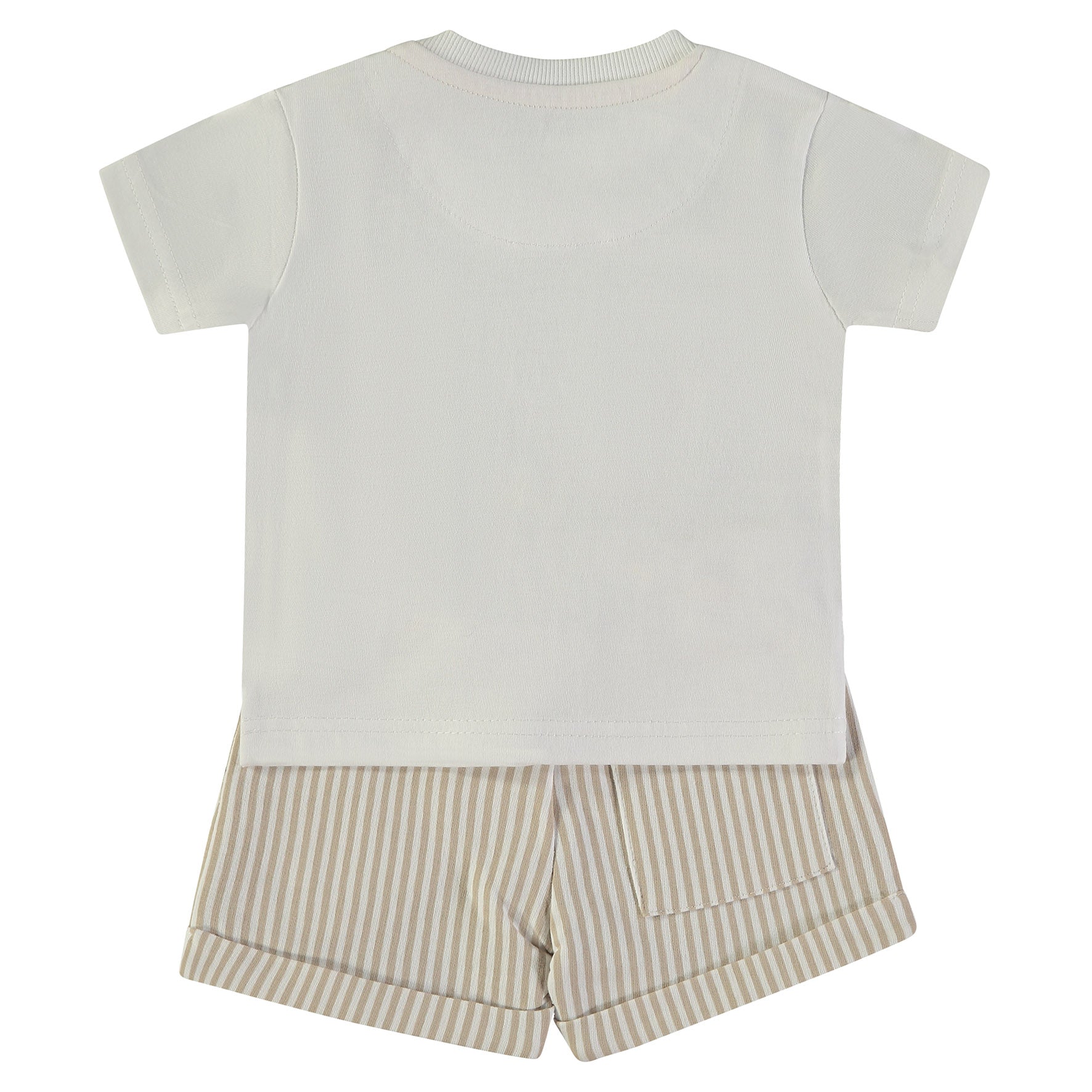 Conjunto Playero "Riding Waves" ¡Listos para la aventura! Este conjunto de dos piezas combina una camiseta de algodón suave con un divertido gráfico surfero y shorts de rayas clásicas. Perfecto para hermanos que aman el sol y jugar en la arena. Comodidad y estilo marinero en un solo look.