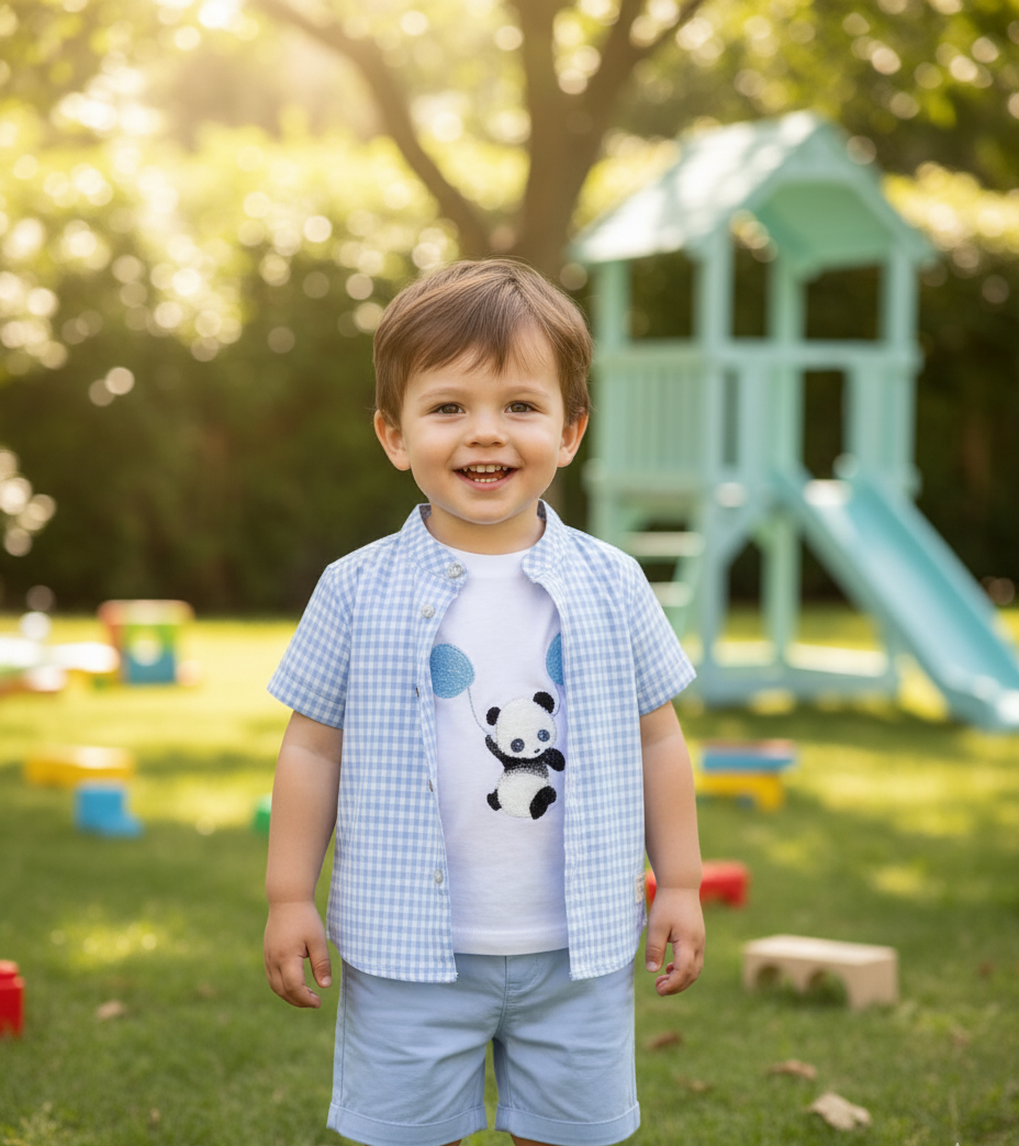 Conjunto de tres piezas camiseta panda, camisa y pantalón corto