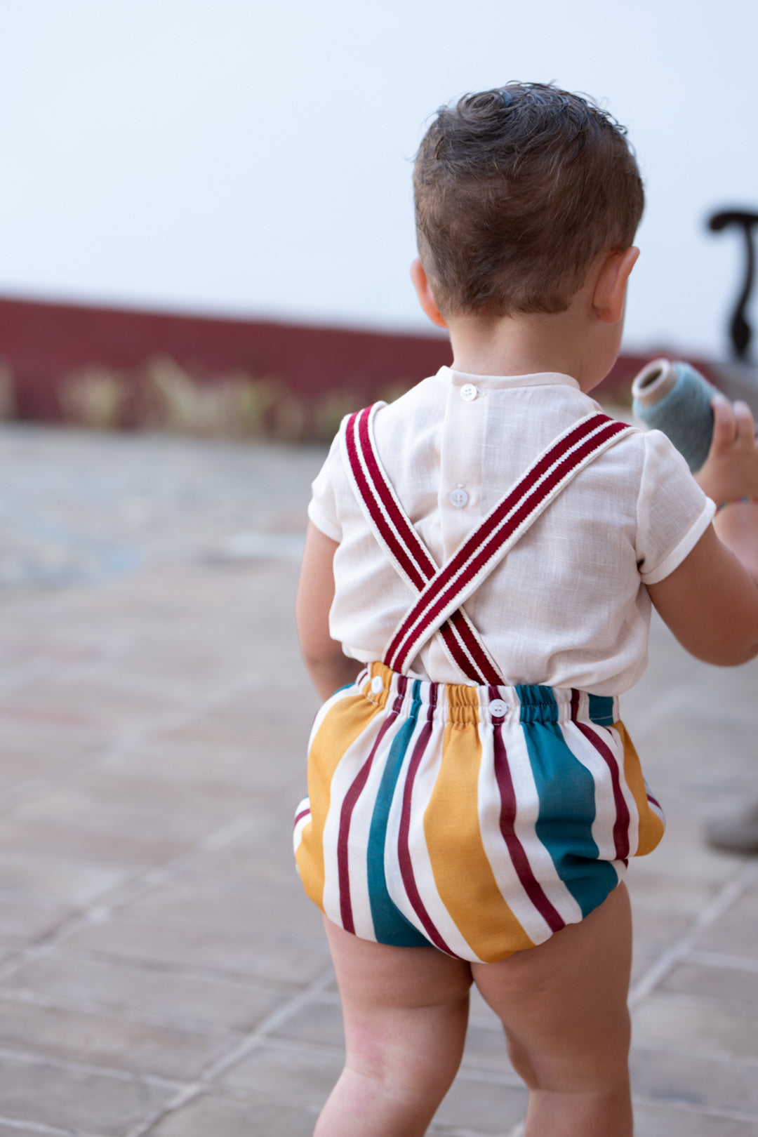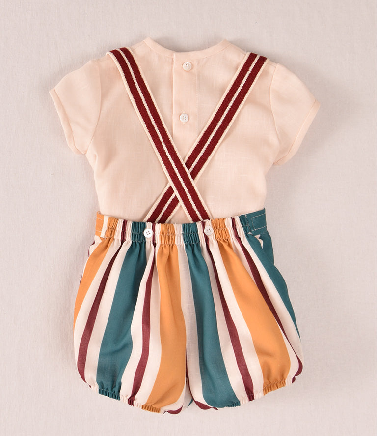 Bombacho: Diseño de rayas verticales en una paleta de colores tierra (ocre, burdeos y verde azulado). Incluye tirantes integrados a juego que completan este look tan especial.