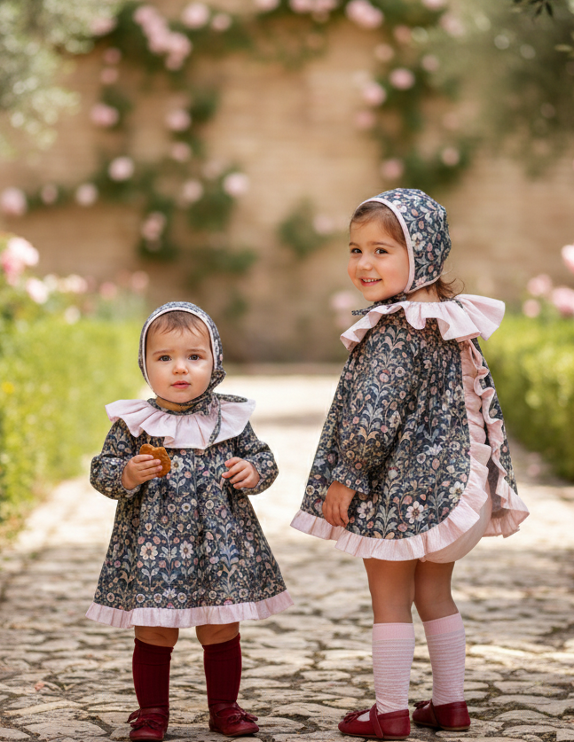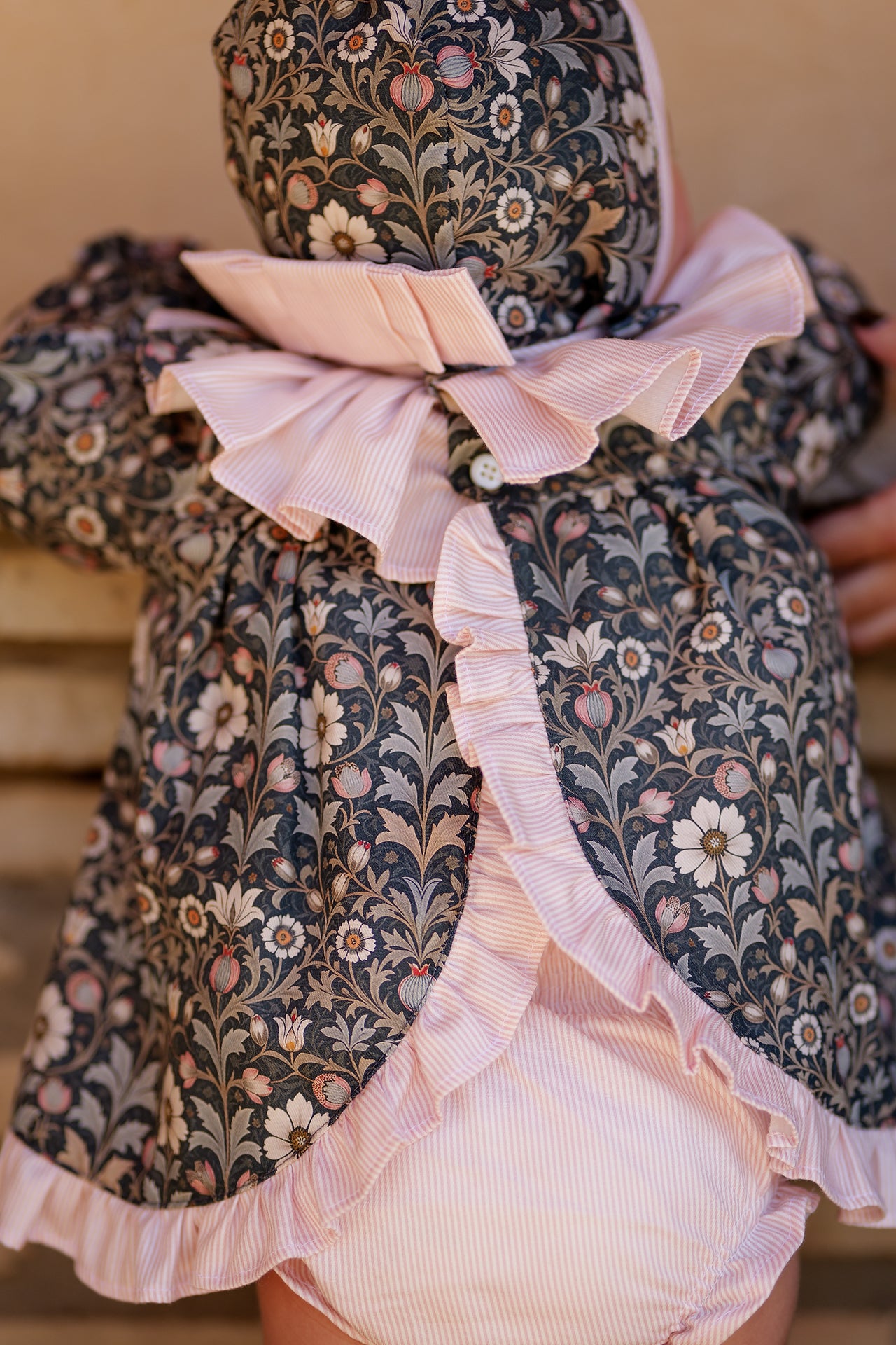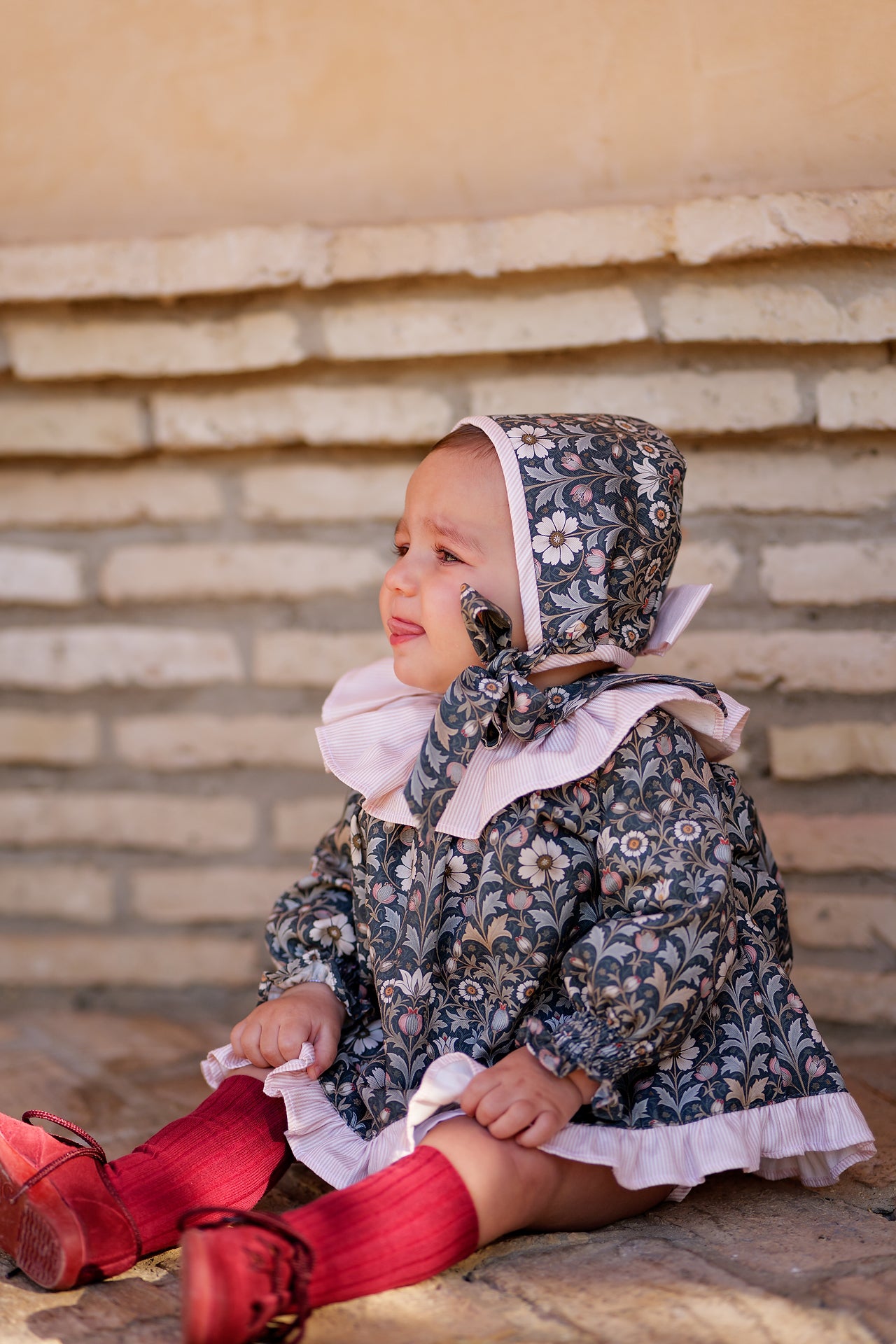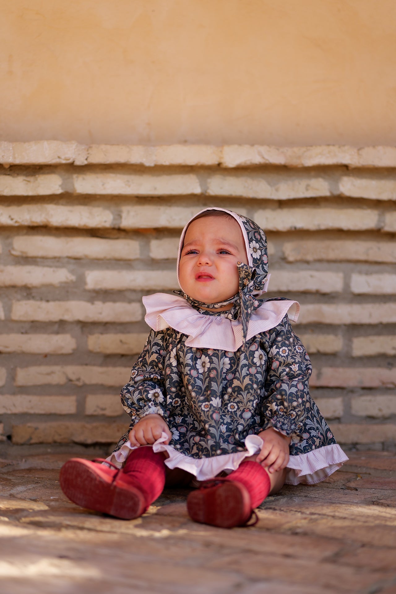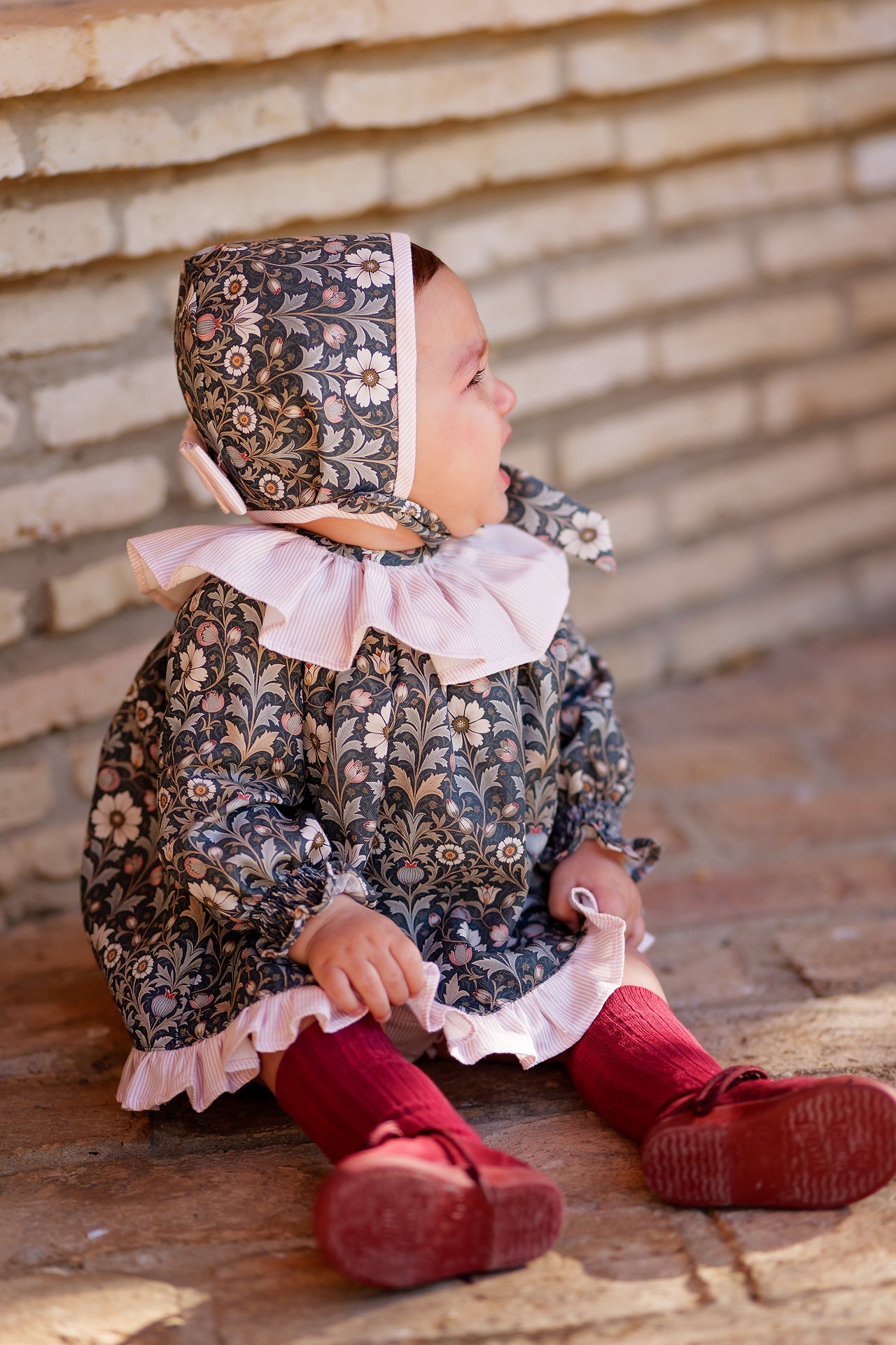 Estampado y colores: El vestido y la capota presentan un hermoso estampado floral con fondo oscuro (gris verdoso) decorado con flores blancas, rosa empolvado y detalles en verde. La braguita y los detalles de volantes están confeccionados en una tela de canalé rosa claro, que añade un toque suave y elegante.