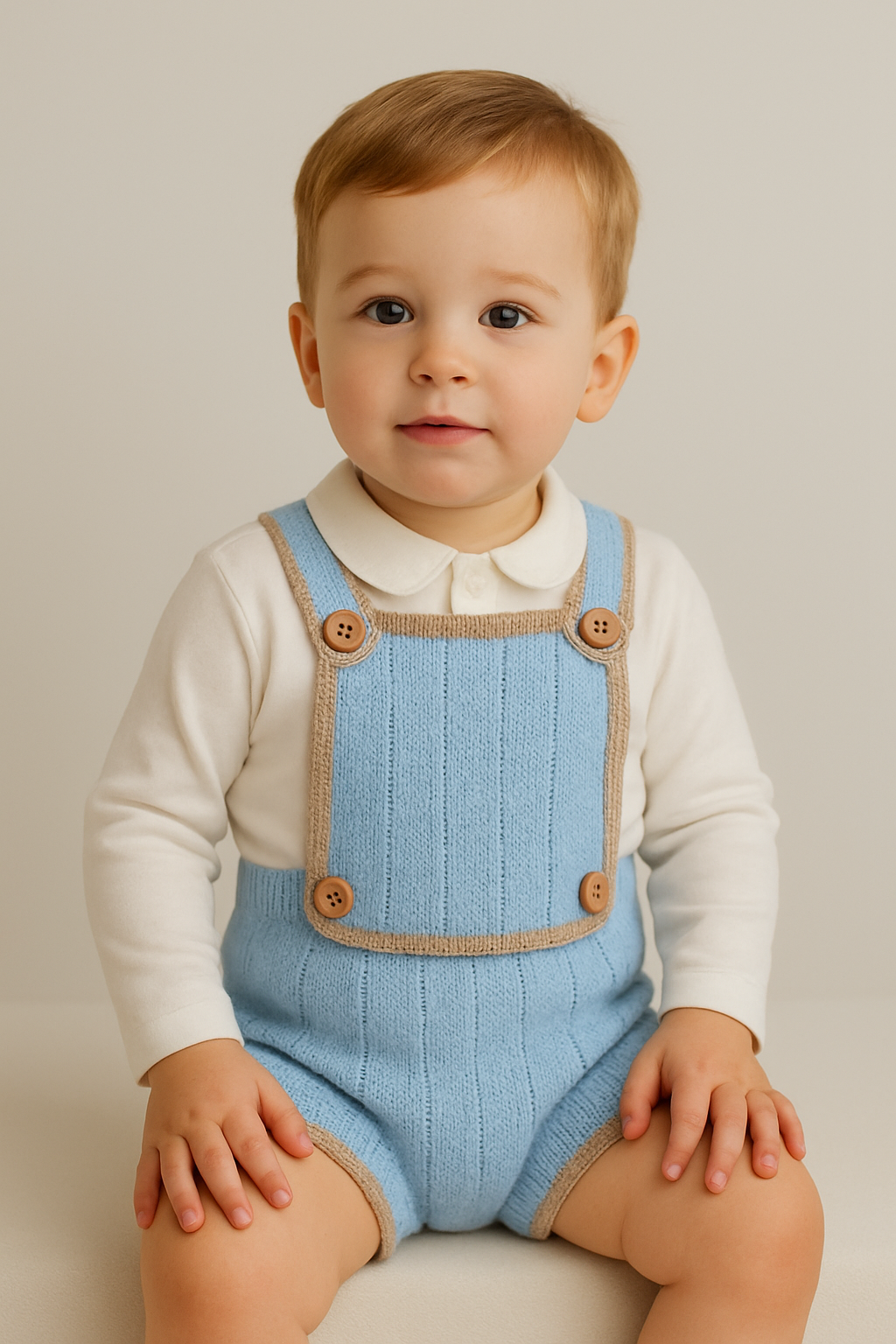 Peto de punto: tejido en color azul celeste con delicado diseño calado. Lleva tirantes anchos abrochados al frente con botones de madera decorativos y ribetes en color beige que enmarcan los bordes del peto y las perneras, dándole un toque muy fino y tradicional. El tejido es elástico y cómodo, pensado para que el niño pueda moverse libremente.