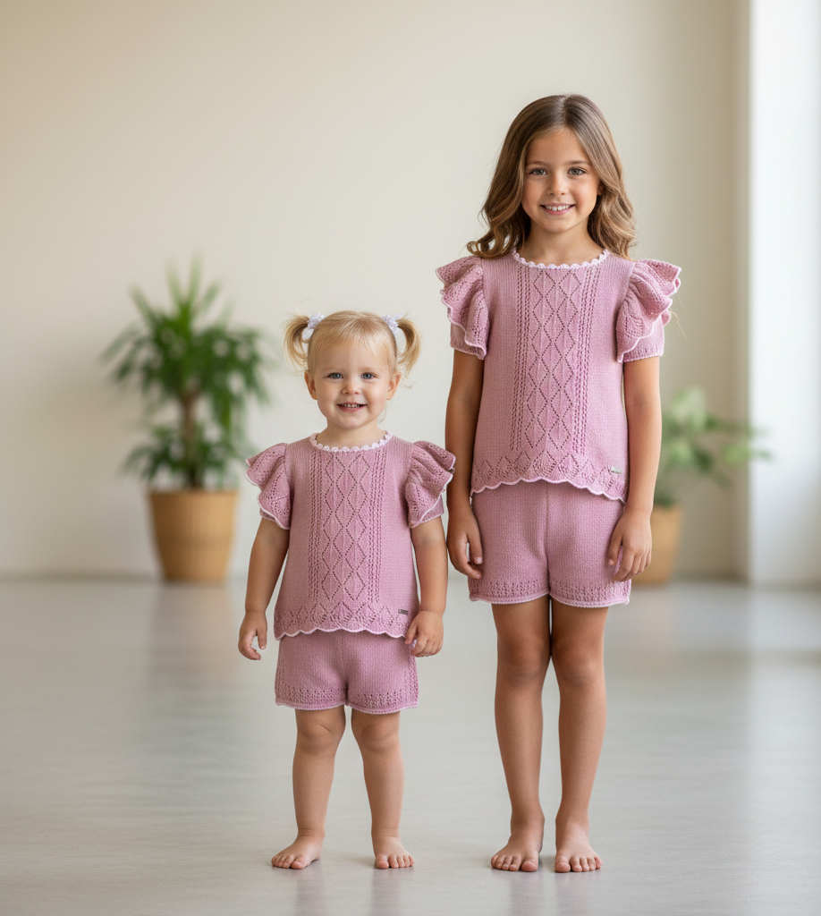 🎀Conjunto Short de punto maquillaje con volantes en los hombros de punto y rematado con rosa claro en los filos