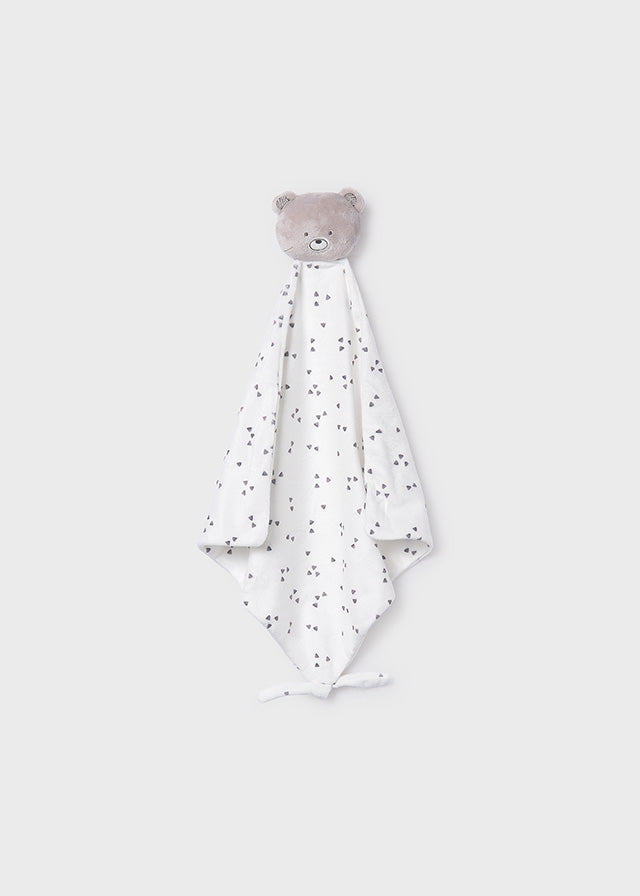 Personaje: En la parte superior destaca la cabeza de un osito de peluche en color gris suave. Tiene detalles bordados (ojos y nariz) para garantizar la seguridad del bebé, evitando piezas plásticas que se puedan desprender.