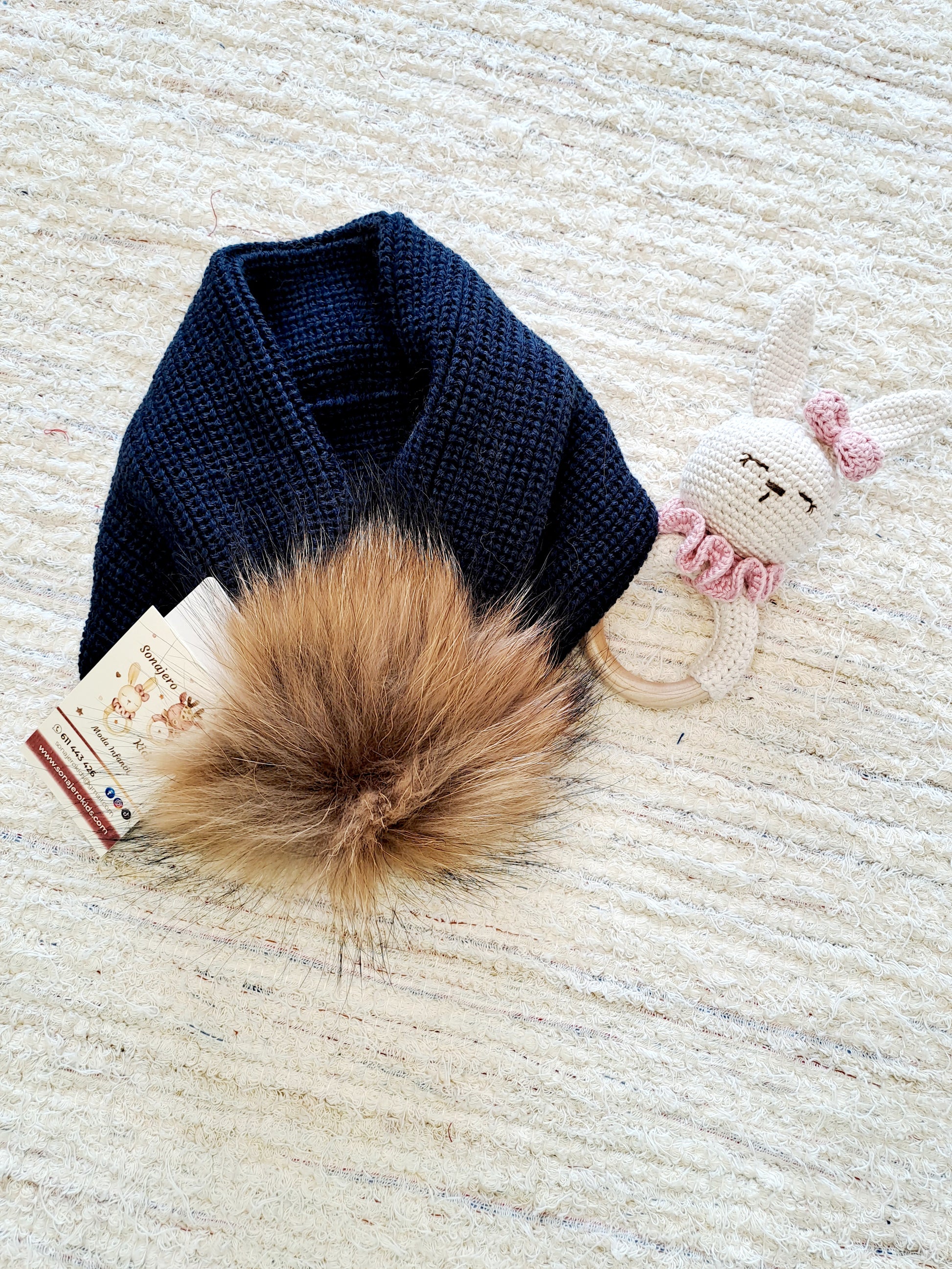 Una bufanda de lana que se transforma en Gorro, el pompón se le puede quitar.
