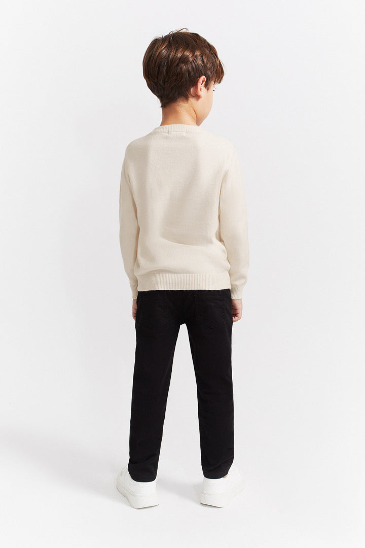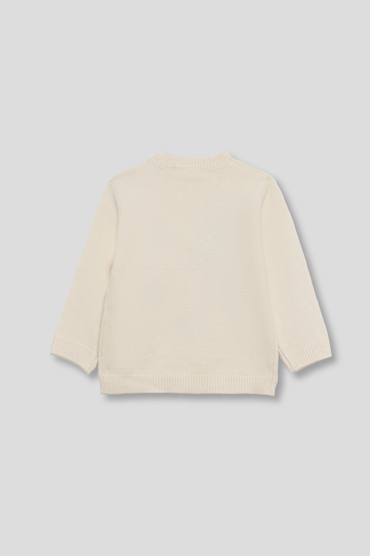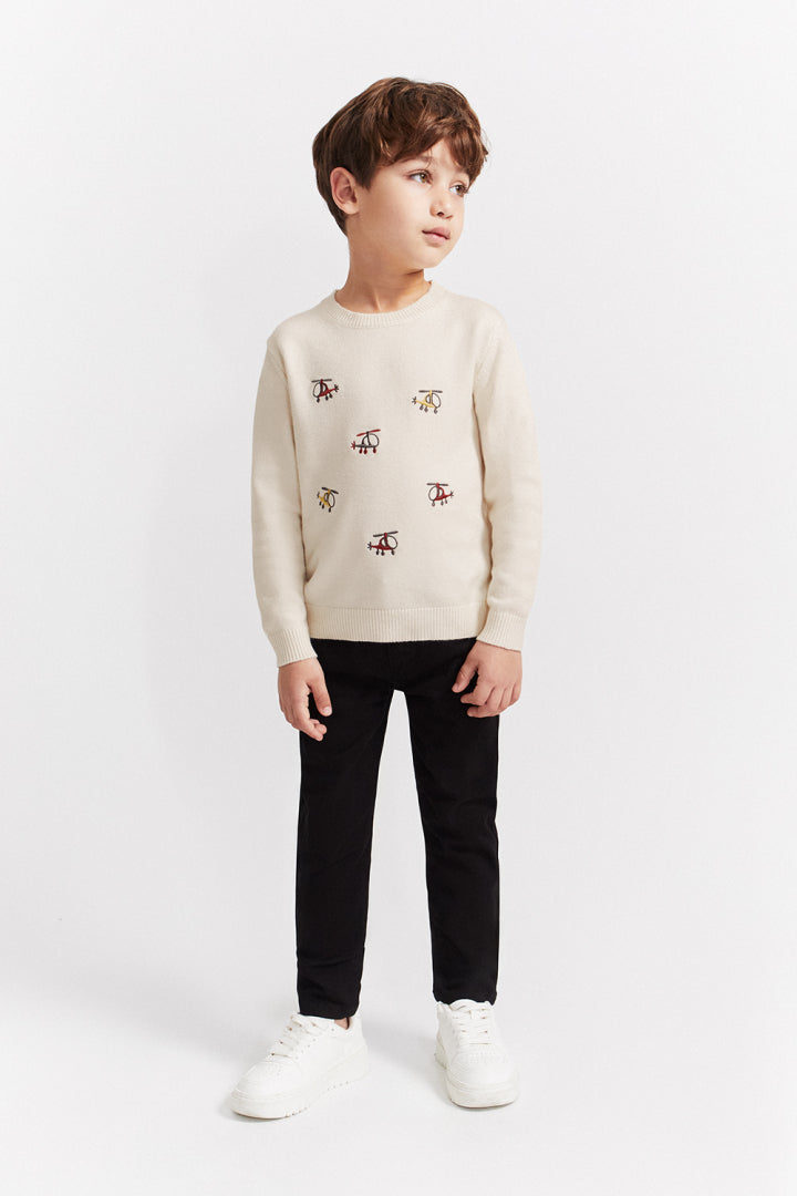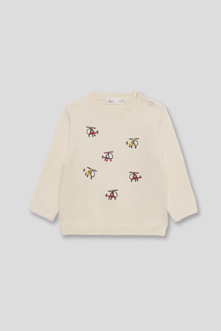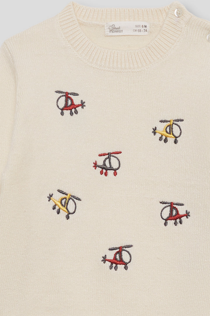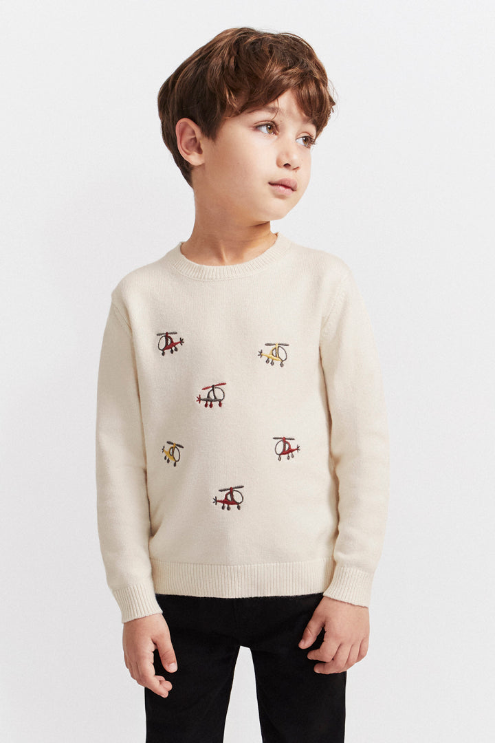 Diseño en color crudo con divertidos bordados de helicópteros en tonos burdeos, mostaza y gris oscuro repartidos por la parte delantera. Cuello redondo, bajo y puños acanalados que aportan un ajuste cómodo. Confeccionado en punto suave y cálido, ideal para los días fríos de invierno.