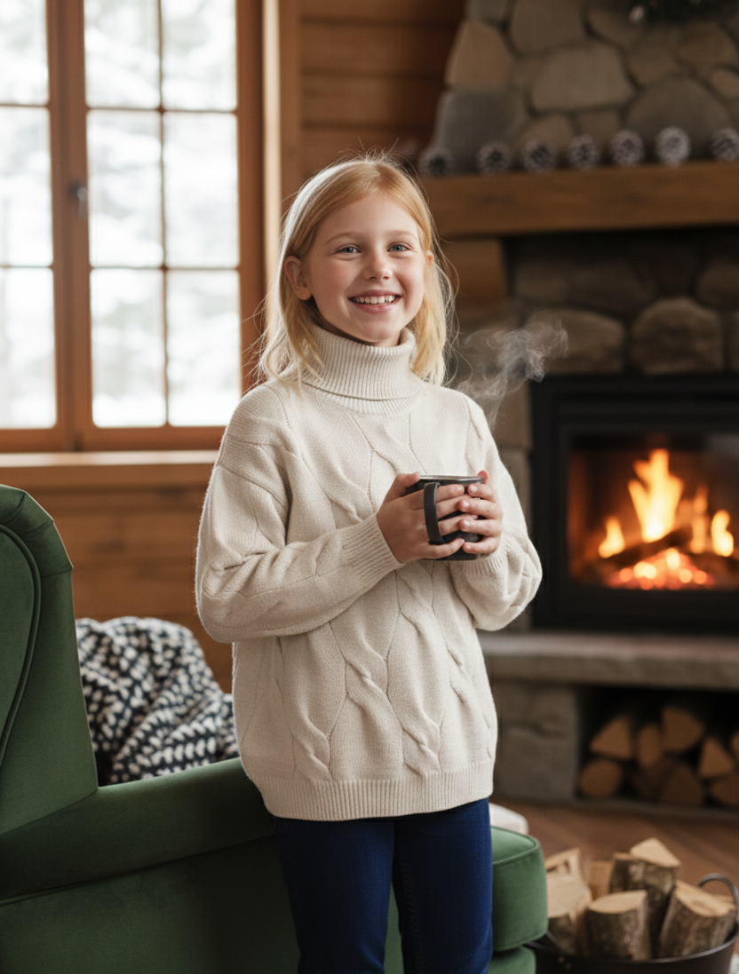 Jersey trenzado con cuello vuelto, disponible en tres colores: celeste, maquillaje y beige. Confeccionado en un cálido punto de tacto suave, presenta diseño de ochos en la parte frontal y mangas, y acabados en canalé en el cuello, puños y bajo. Su corte recto y confortable lo convierte en una prenda ideal para el día a día.