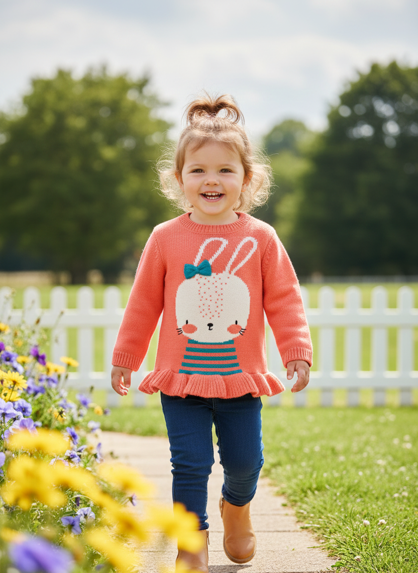 jersey para bebé niña Este encantador jersey de punto en color coral, decorado con un adorable diseño de conejo en la parte delantera. El conejo tiene detalles en azul y rosa, lo que añade un toque alegre y divertido al conjunto. El suéter presenta un ribete con volantes en el borde inferior, que aporta un toque femenino y elegante.