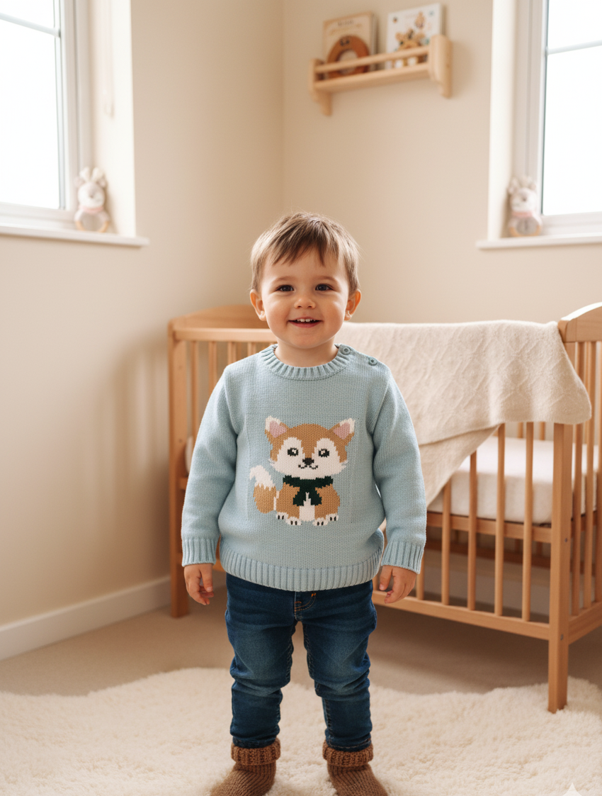 Este conjunto infantil es encantador y delicado, ideal para un bebé. Se compone de un suéter tejido en tono celeste claro con un diseño adorable de un zorrito en el centro. El zorrito tiene un lazo verde oscuro y detalles en blanco, marrón y negro, lo que le da un toque tierno y expresivo. El suéter presenta botones en el hombro para facilitar el cambio de ropa y un acabado acanalado en los puños, el cuello y el borde inferior, lo que lo hace cómodo y cálido.