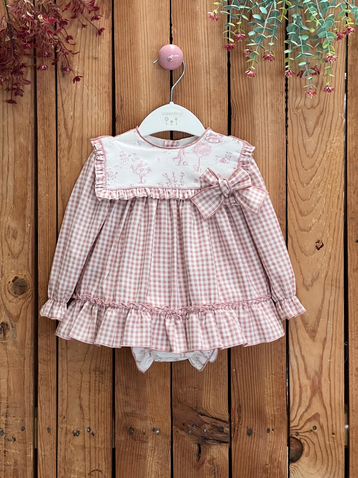 El conjunto infantil de vestido vichy y braguita de algodón color blanco con estampado con un diseño clásico con estampado y volante en el cuerpo un lazo en el cuello , confeccionado en un material suave y cálido.