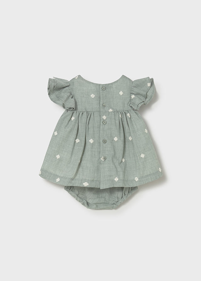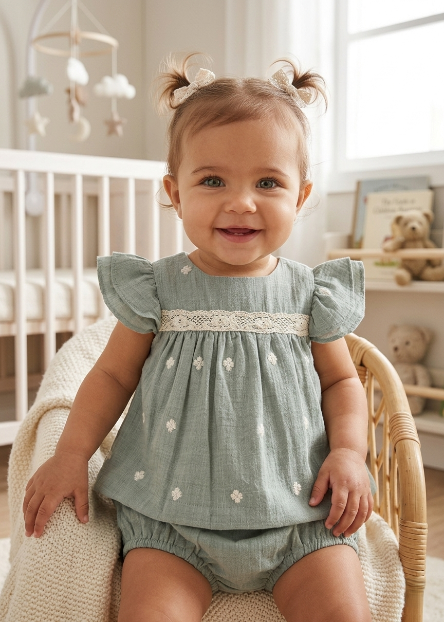 Jesusito de muselina en verde salvia con delicados bordados florales Viste a tu pequeña con este jesusito de muselina de algodón orgánico, suave y transpirable. El precioso tono verde salvia se realza con un exquisito bordado floral blanco y un elegante encaje de bolillos a juego en el pecho. Un diseño atemporal y lleno de encanto para las ocasiones más especiales.