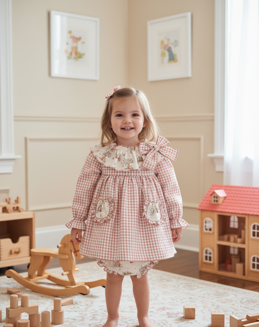 El conjunto infantil de vestido y braguita 2 piezas de algodón color vichy y estampado de ositos con un diseño clásico con estampado de osos y volante en el cuerpo con lazo , confeccionado en un material suave y cálido.