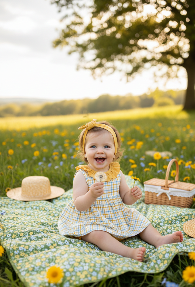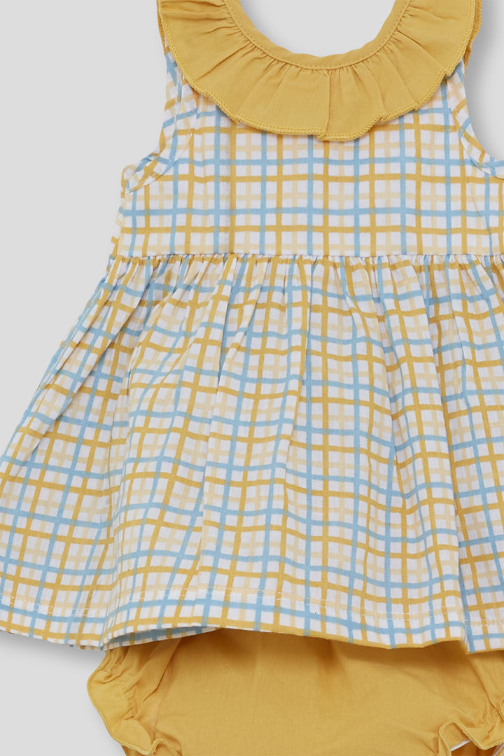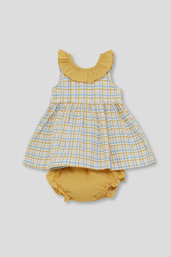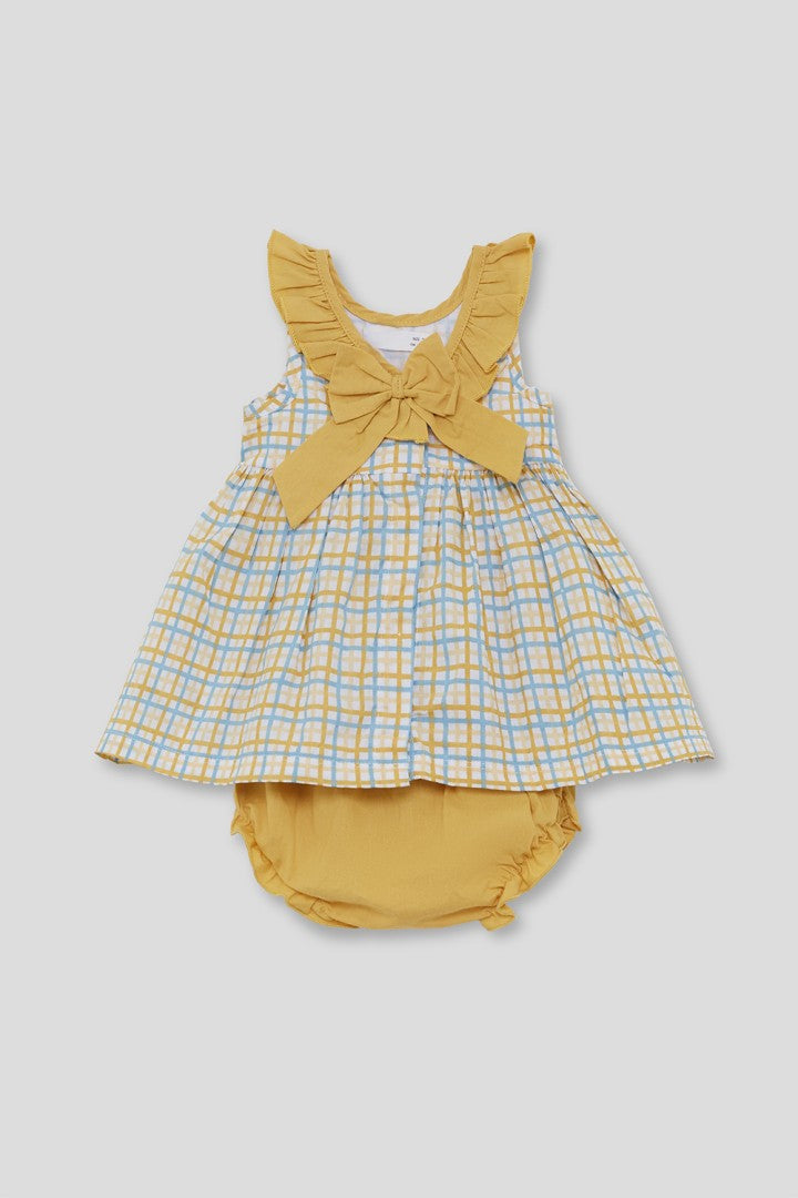 Conjunto de dos piezas para bebé niña de 3 a 24 meses. Vestido sin mangas en cuadro amarillo con volante en el cuello y lazo decorativo en la espalda. Braguita a juego en color mostaza con cintura elástica. Tejido ligero y cómodo, ideal para verano.
