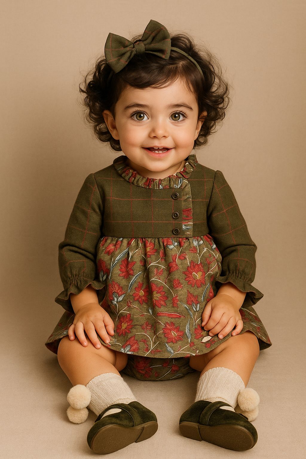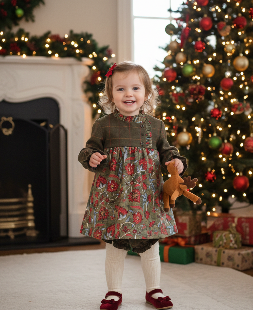 Este conjunto de bebé de alta calidad incluye vestido y braguita,, combinando elegancia y dulzura. El vestido, en tejido de flores en base verdeo, lleva un remate floral como volante a juego. El bombacho fruncido en la misma tela del pecho y mangas, completan el look. Confeccionado en materiales suaves, es ideal para ocasiones especiales.