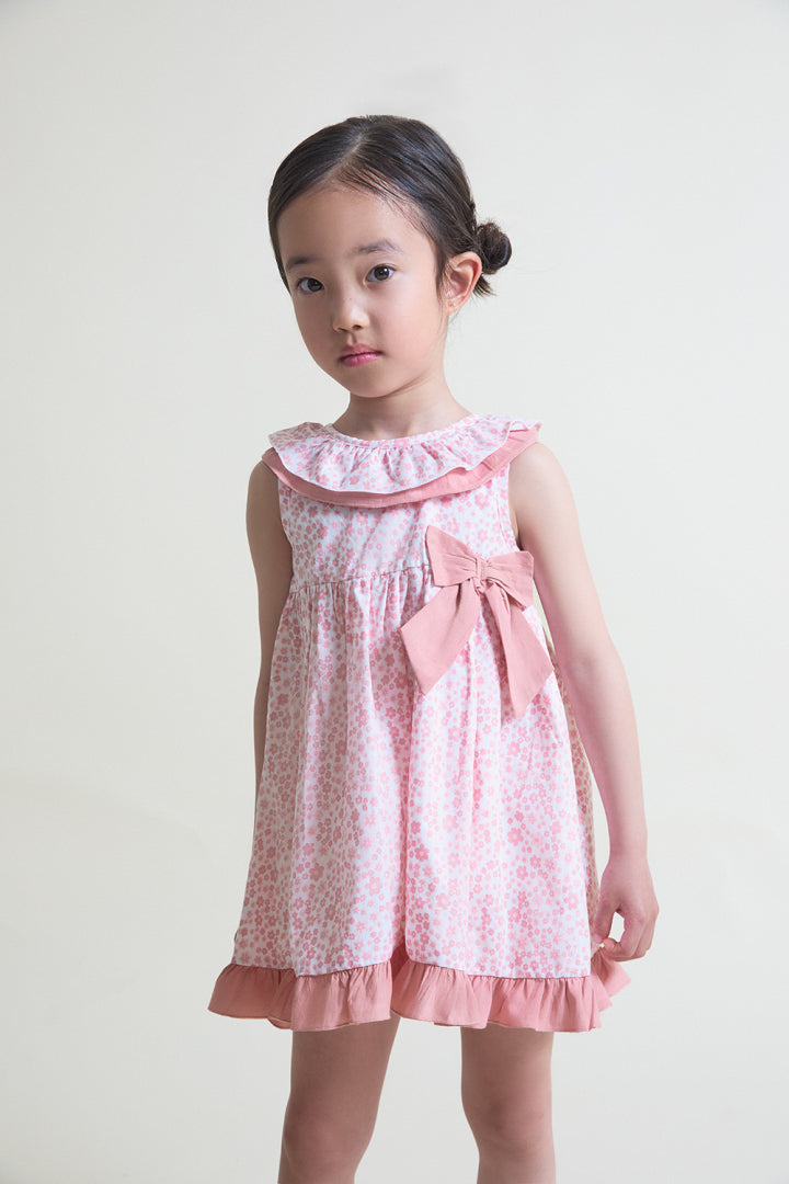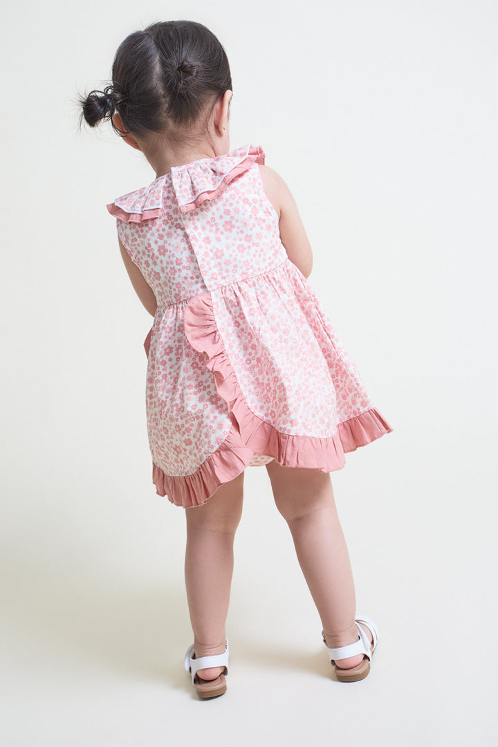 Conjunto de dos piezas para recién nacido niña de 3 a 24 meses. Vestido sin mangas en estampado floral color maquillaje sobre fondo crudo. Presenta cuello volante a juego y detalle de lazo decorativo en la cintura. El bajo está acabado con franja en color maquillaje que aporta un contraste delicado. La parte trasera incluye cierre con botones a presión para facilitar la puesta. Braguita a juego en el mismo estampado, con cintura y bajos elásticos que aseguran un ajuste cómodo. Confeccionado en tejido fresco y transpirable, ideal para el verano, aportando comodidad y dulzura en cada detalle.