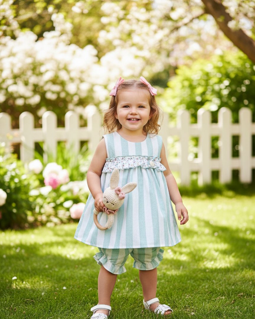 💙 Jesusito de rallas Verde empolvado, de braguita y tira fruncida. 🩵