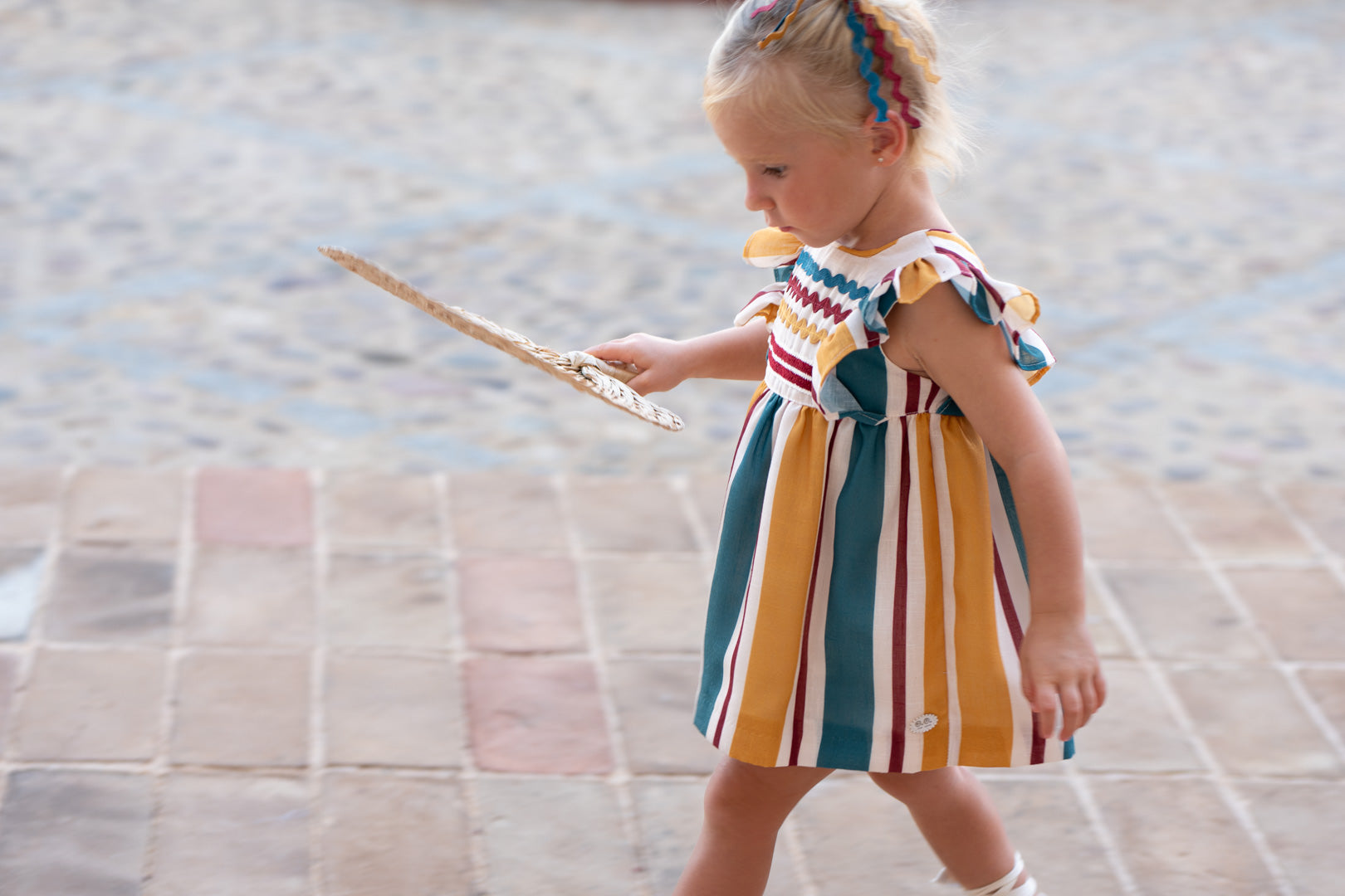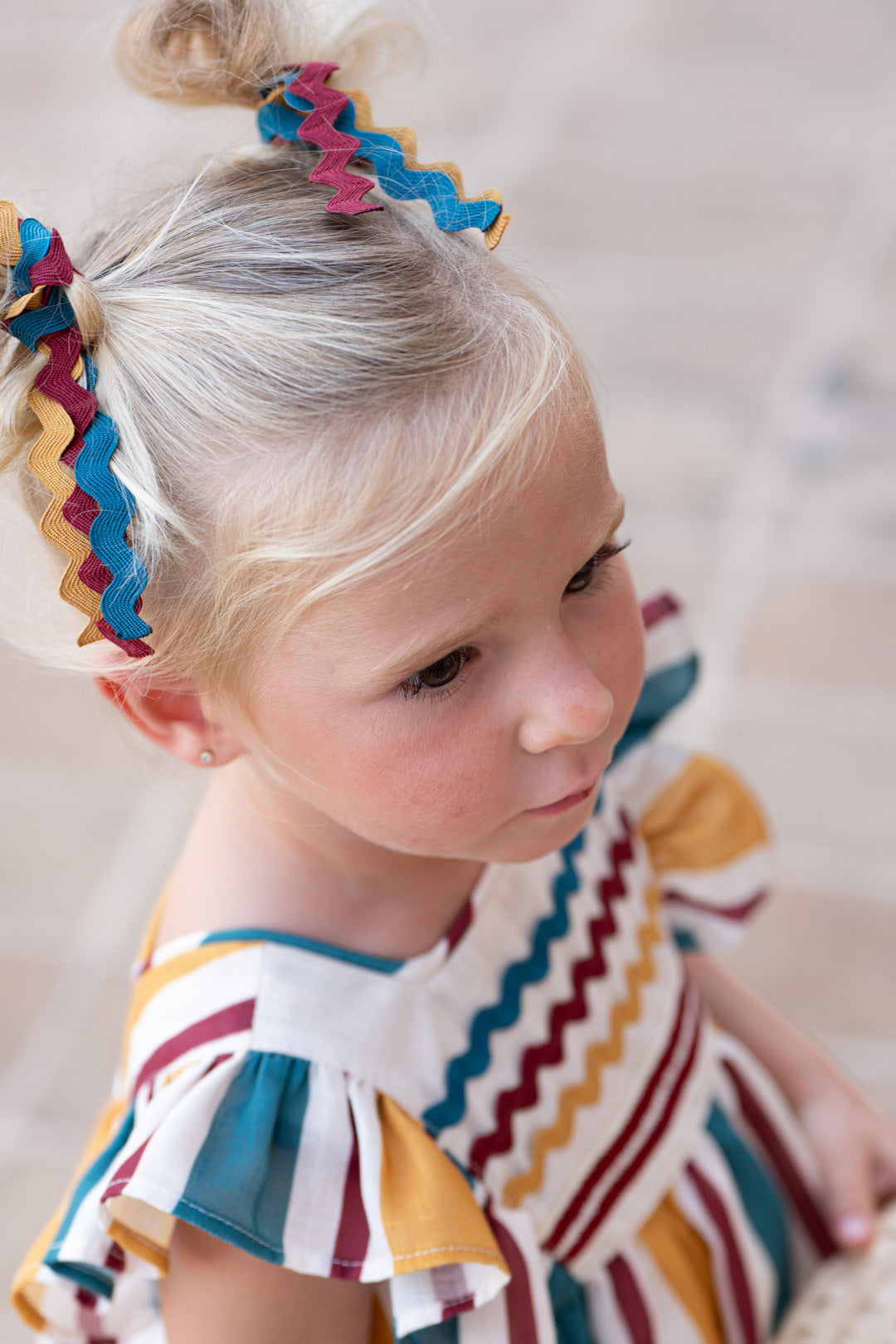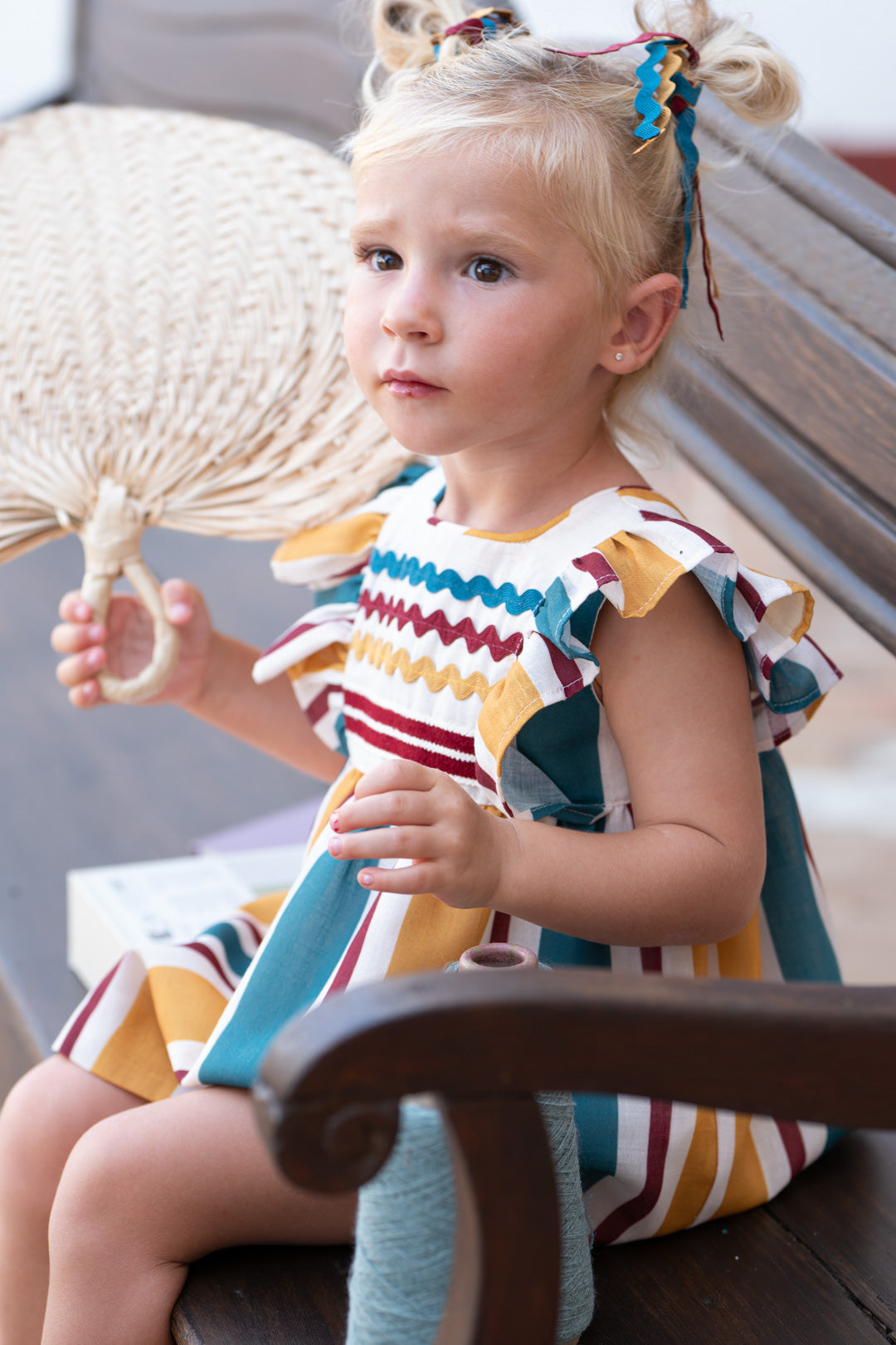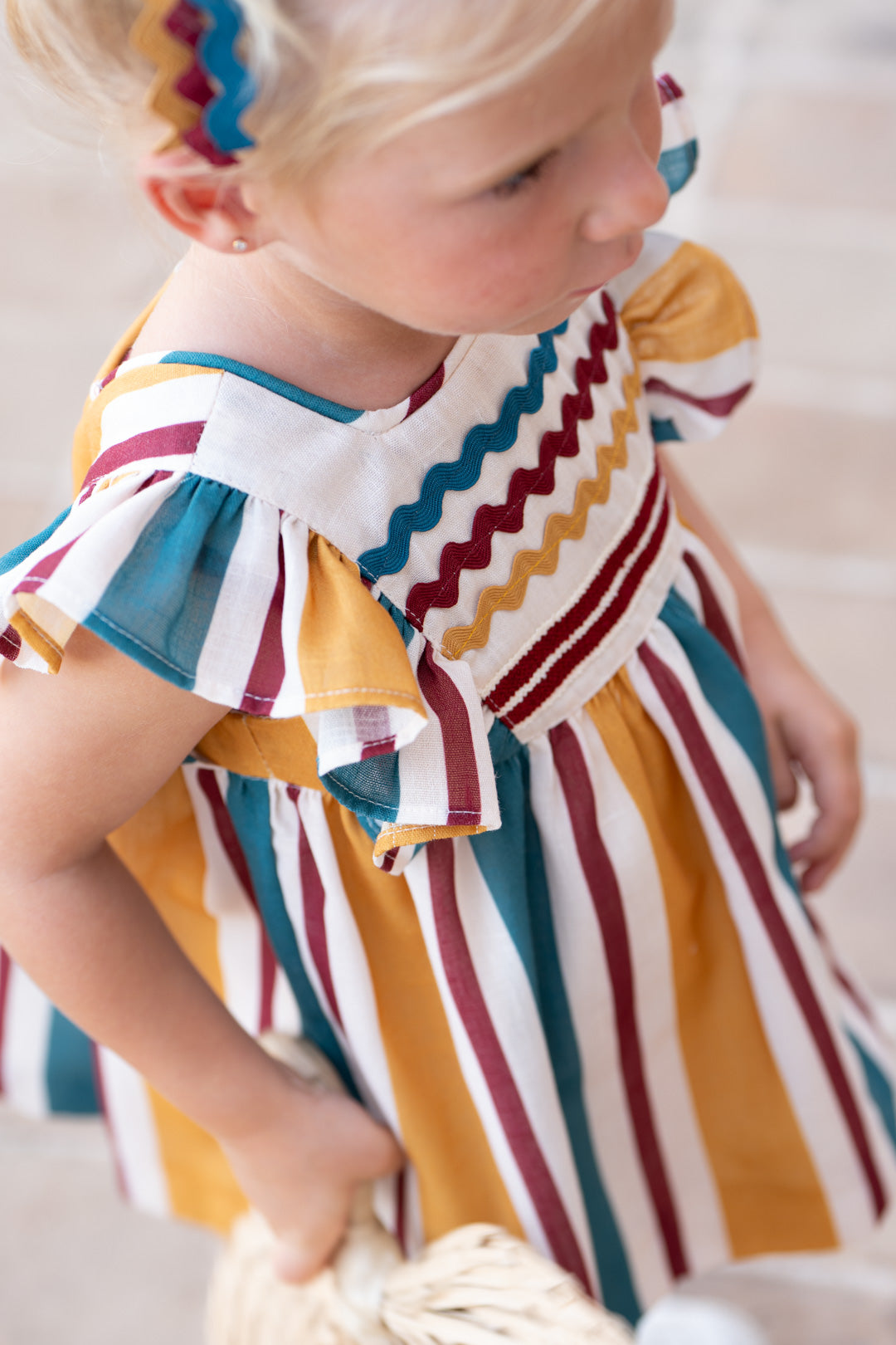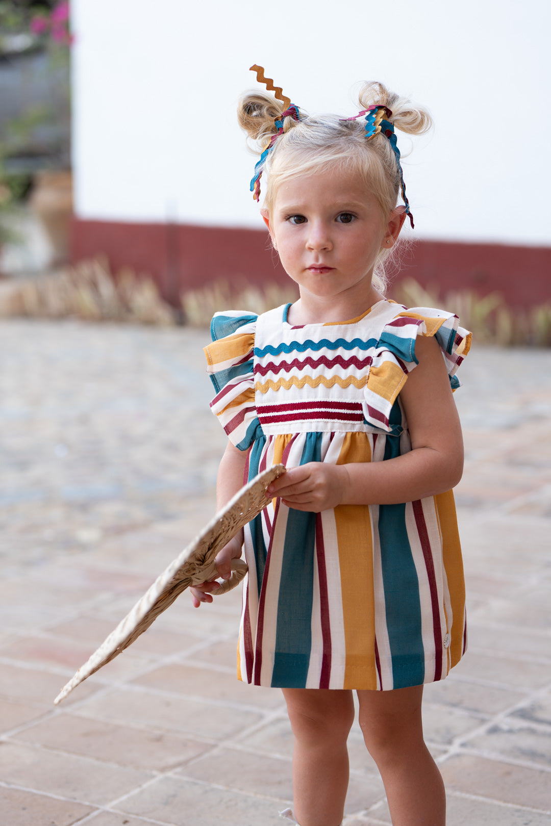¡Pura alegría y estilo para las más pequeñas! Este encantador conjunto de dos piezas destaca por su vibrante diseño de rayas verticales en tonos mostaza, burdeos y azul petróleo sobre un fondo crema. Es la elección perfecta para combinar comodidad y elegancia en cualquier ocasión especial.