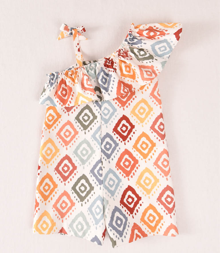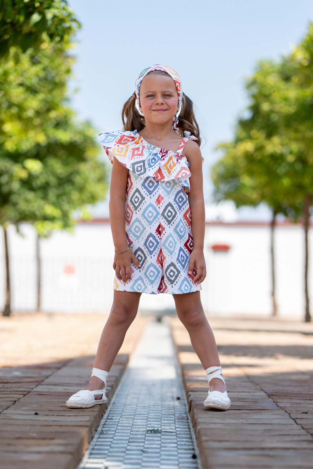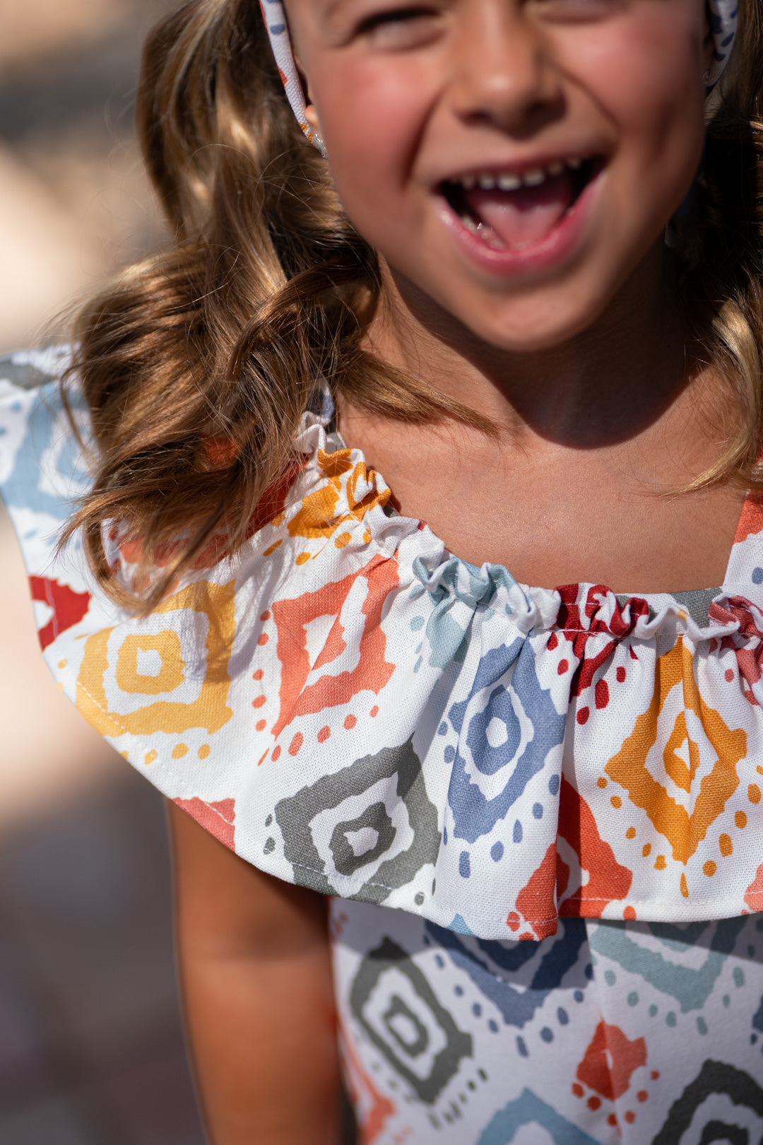 Estampado: Presenta un diseño geométrico de estilo ikat o étnico. Los motivos son rombos concéntricos en una paleta de colores tierra y veraniegos: terracota, azul cielo, mostaza y gris oscuro sobre un fondo blanco.