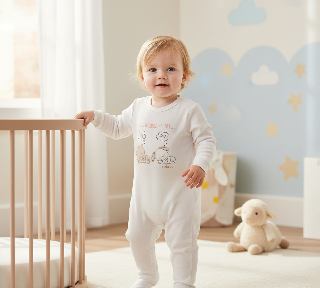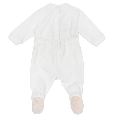 Este adorable pelele de bebé de manga larga y de pies cubiertos, ideal para mantener al bebé cómodo y abrigado. Es de color blanco con un tierno estampado bordado en el frente que muestra a un osito con un reloj despertador y un perrito dormido, acompañado del mensaje “Good Morning – Chicco”. Se abrocha en la parte trasera con prácticos broches de presión para facilitar el cambio de ropa.
