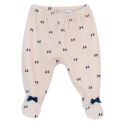 Pies cerrados con detalles decorativos de lazos, manteniendo los pies del bebé abrigados sin necesidad de calcetines.