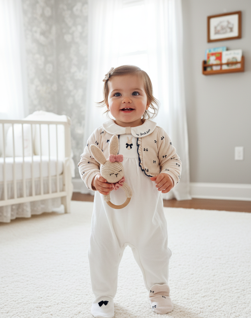 Pies cerrados con detalles decorativos de lazos, manteniendo los pies del bebé abrigados sin necesidad de calcetines.