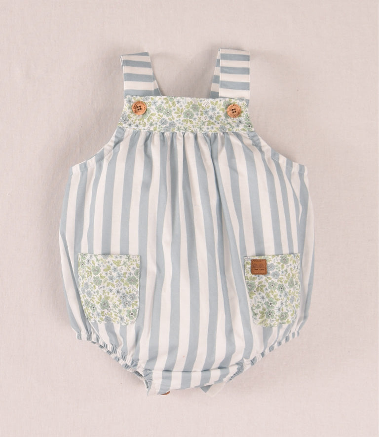 ¡El conjunto perfecto para los días de sol! Este encantador pelele combina la elegancia clásica de las rayas verticales en azul y blanco con un toque dulce de estampado floral en el pecho y los bolsillos.