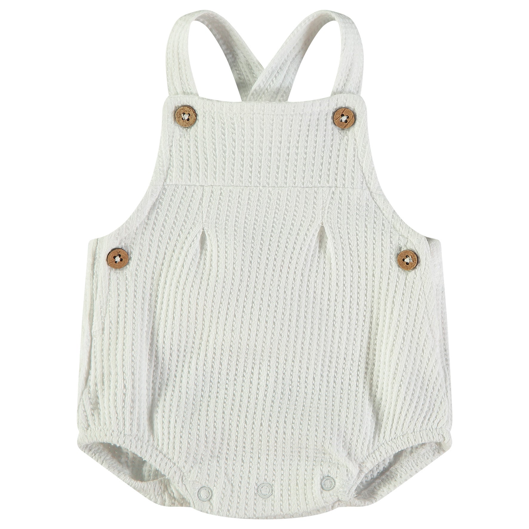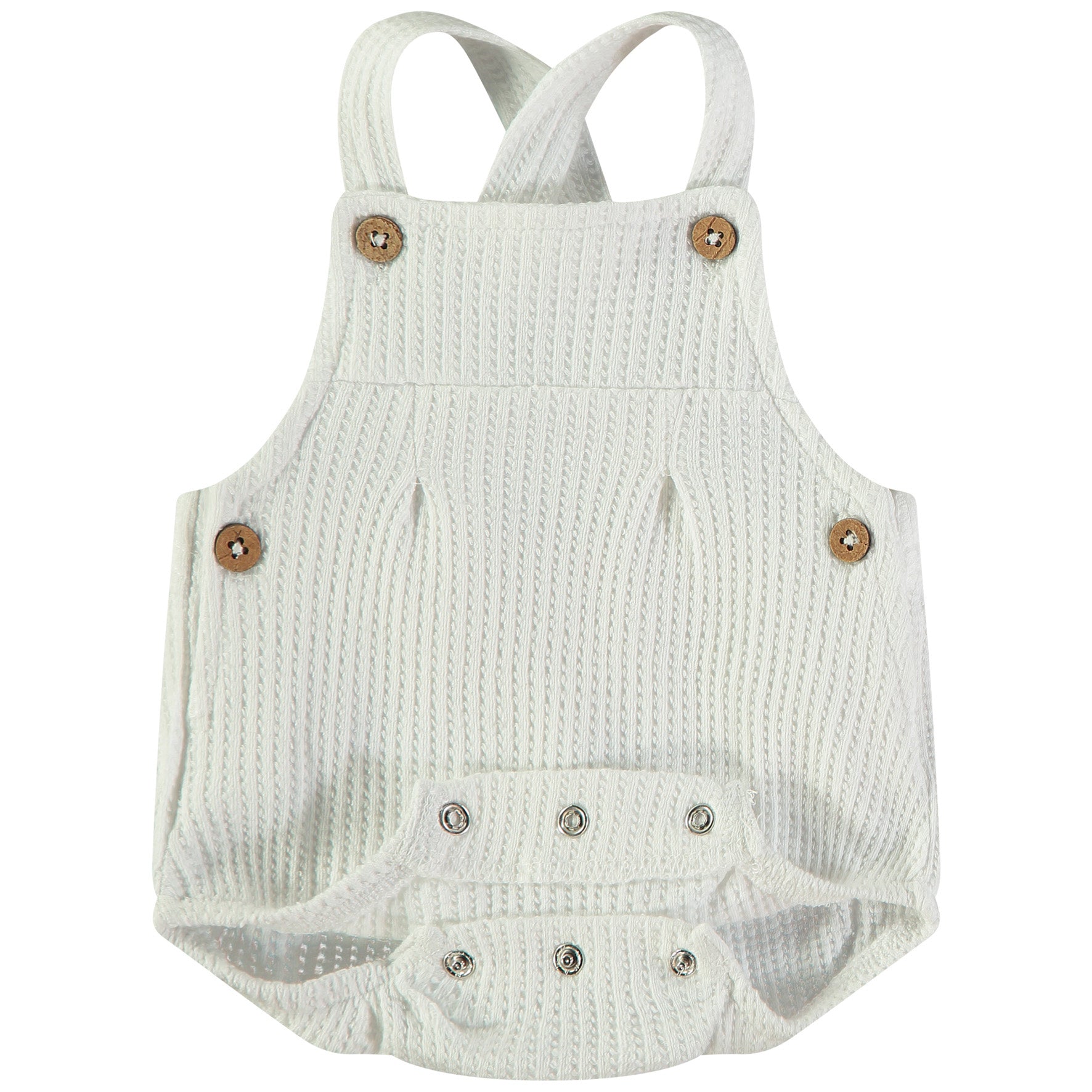 Pechera Recta: La parte superior es sencilla, con tirantes anchos que se cruzan o se ajustan con botones, manteniendo el enfoque en la textura de la prenda.