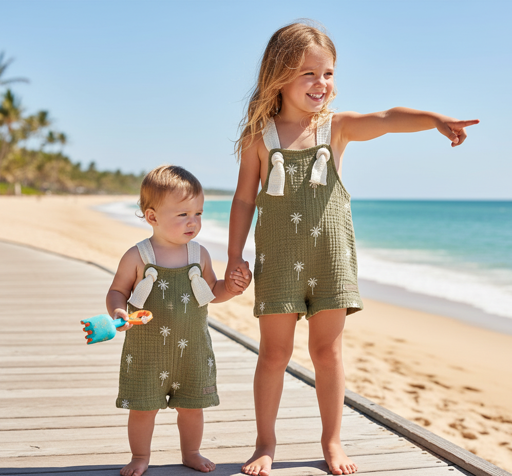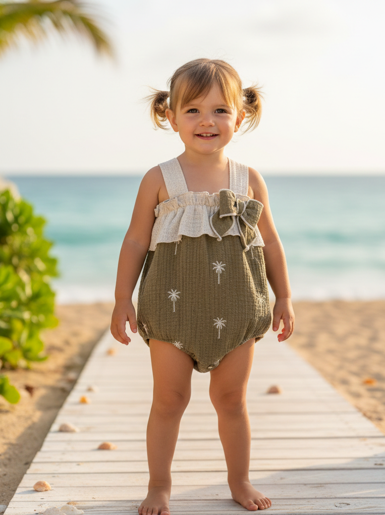 Este encantador pelele estilo bombacho destaca por su diseño rústico y natural. Confeccionado en un suave tejido de muselina en color verde oliva con un delicado estampado de palmeras bordadas, combina a la perfección con un cuerpo superior en lino crudo. Los volantes y el lazo decorativo aportan un toque dulce y artesanal, ideal para que los más pequeños luzcan con estilo y comodidad en los días soleados.