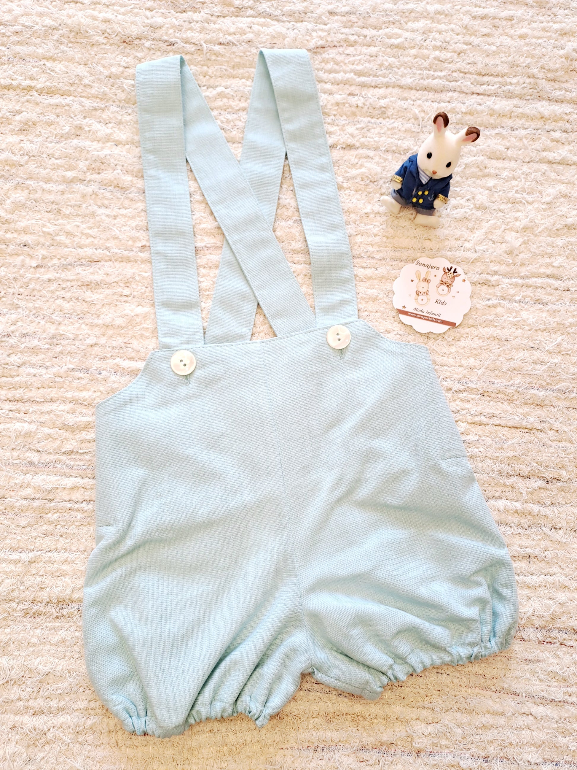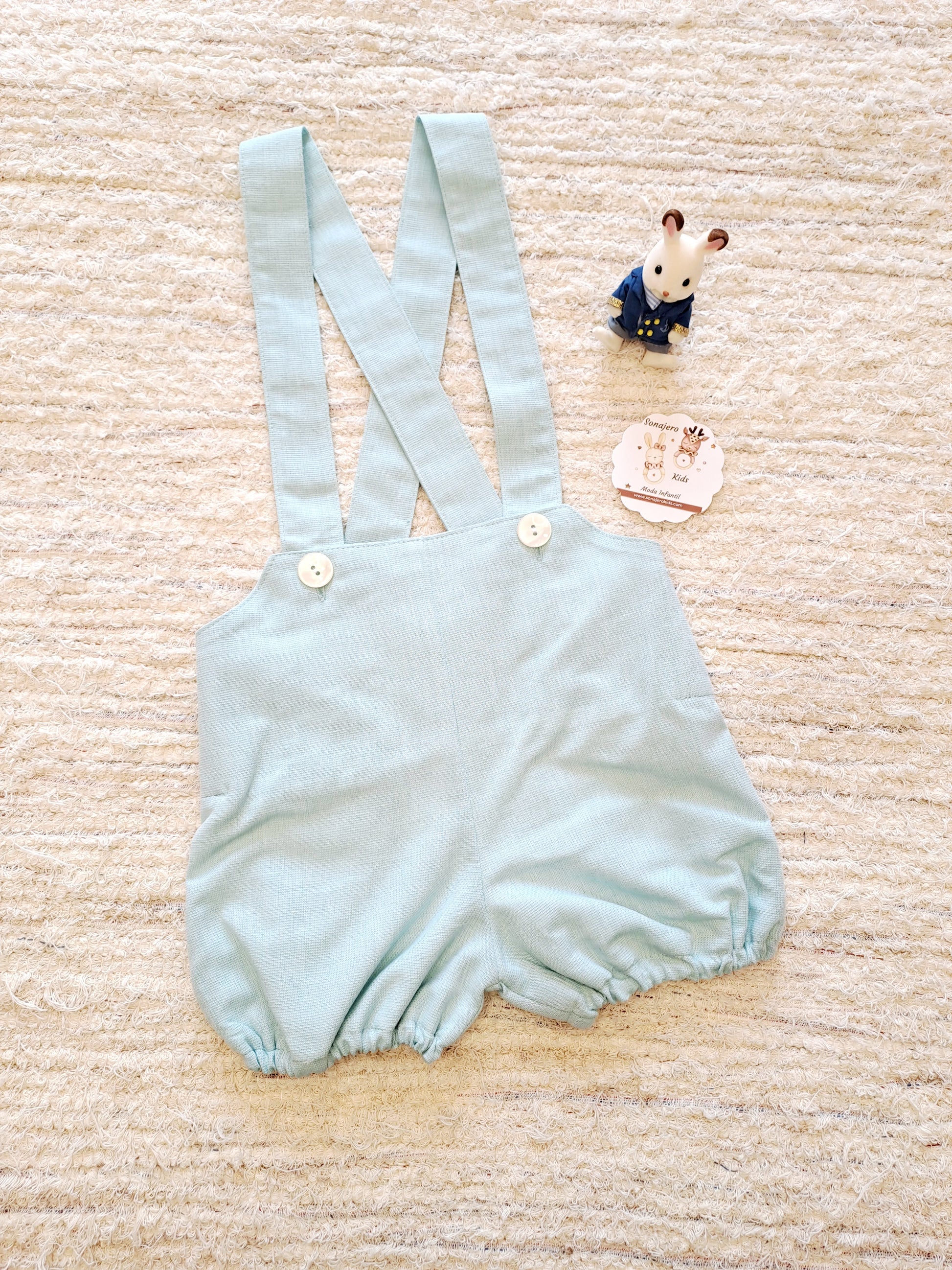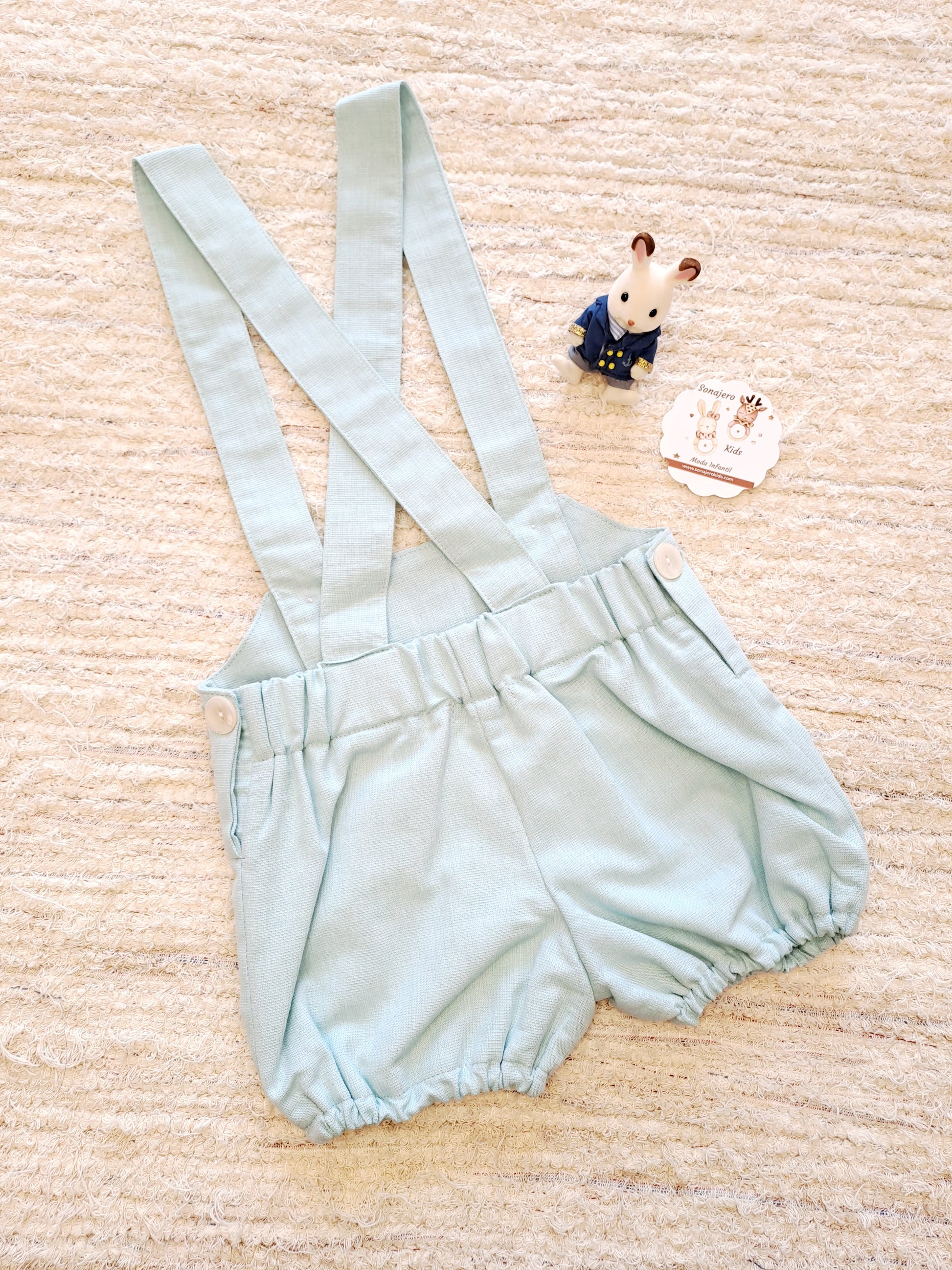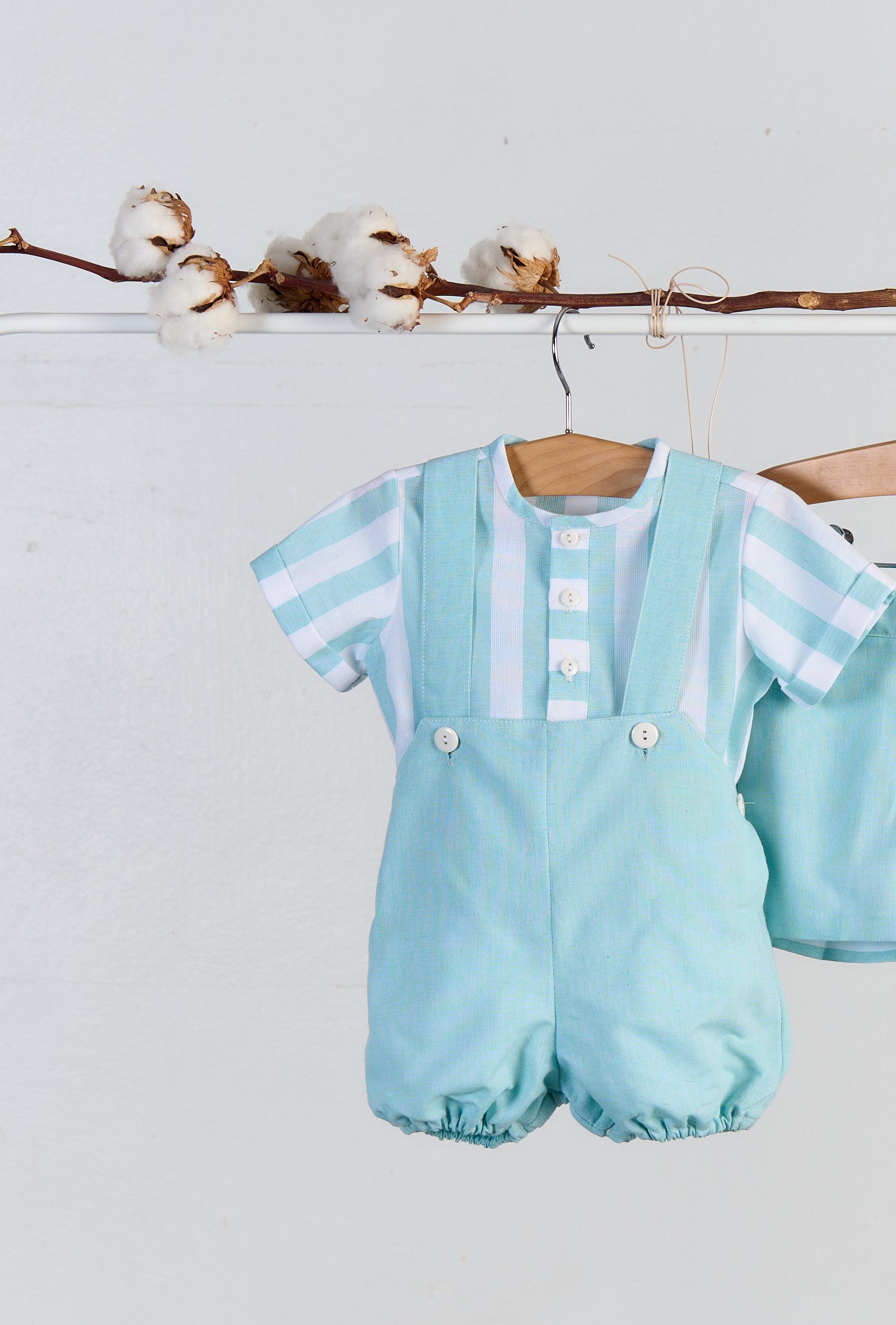 💙 Peto y camisa de verde empolvado, de pantalón corto.🩵