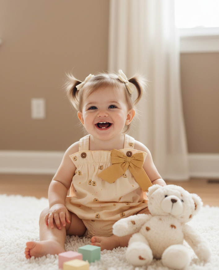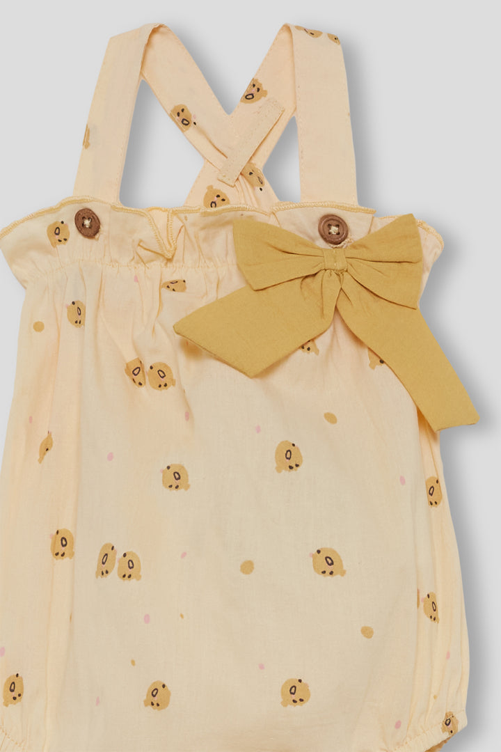 Ranita con tirantes para bebé niña de 3 meses a 6 años. Ranita en color maíz con estampado de pequeños pollitos y lunares. Diseño con tirantes que se cruzan en la espalda y botones en la parte delantera para mayor ajuste. Destaca el lazo decorativo en tejido liso al tono colocado en la cintura, que aporta un aire delicado y coqueto. La prenda cuenta con goma elástica en las piernas para un mejor ajuste y comodidad en el movimiento. Confeccionada en tejido ligero y transpirable, perfecta para los días cálidos de verano.