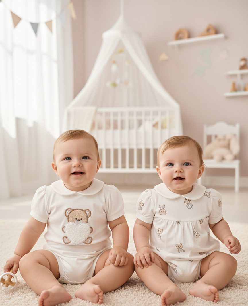 El primer conjunto presenta un dulce oso de peluche bordado en el pecho, con un corazón texturizado que añade un toque extra de ternura. El segundo conjunto está decorado con un delicado patrón repetido de pequeños ositos de peluche que le dan un aire juguetón y encantador.