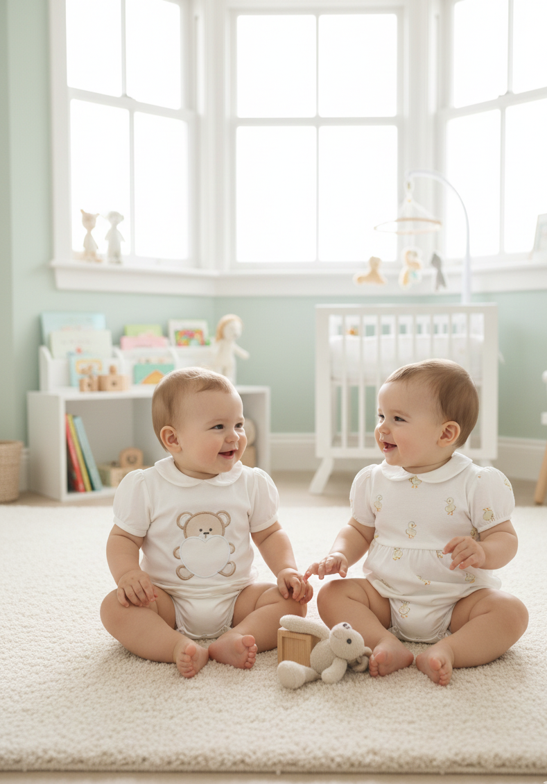 Estos adorables conjuntos para bebé son perfectos para los más pequeños de 1 a 24 meses. Confeccionados en un suave tejido blanco, ambos cuentan con un encantador cuello Peter Pan y mangas cortas abullonadas.