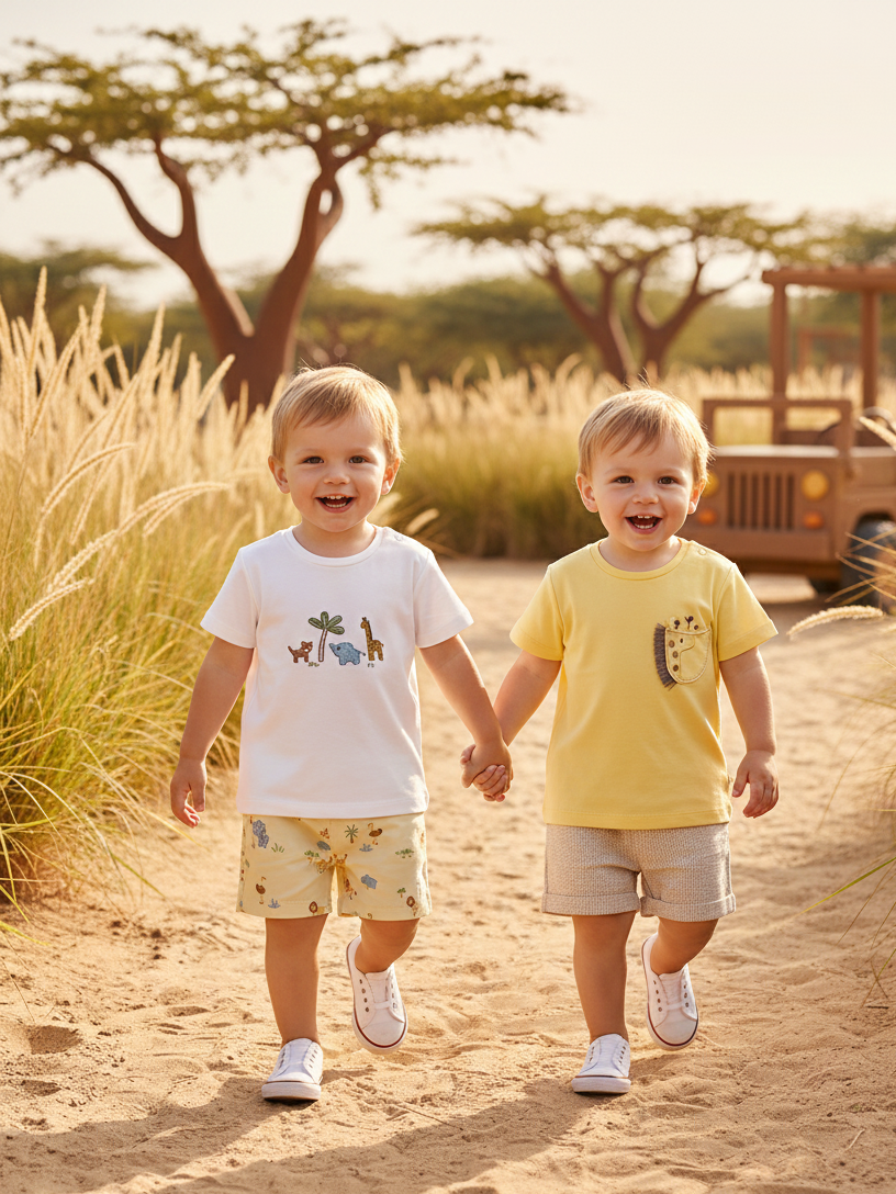 Pantalón corto: En un tono amarillo suave o crema, decorado con un estampado all-over (por toda la prenda) de animales y elementos de la naturaleza, manteniendo la coherencia visual con la camiseta.