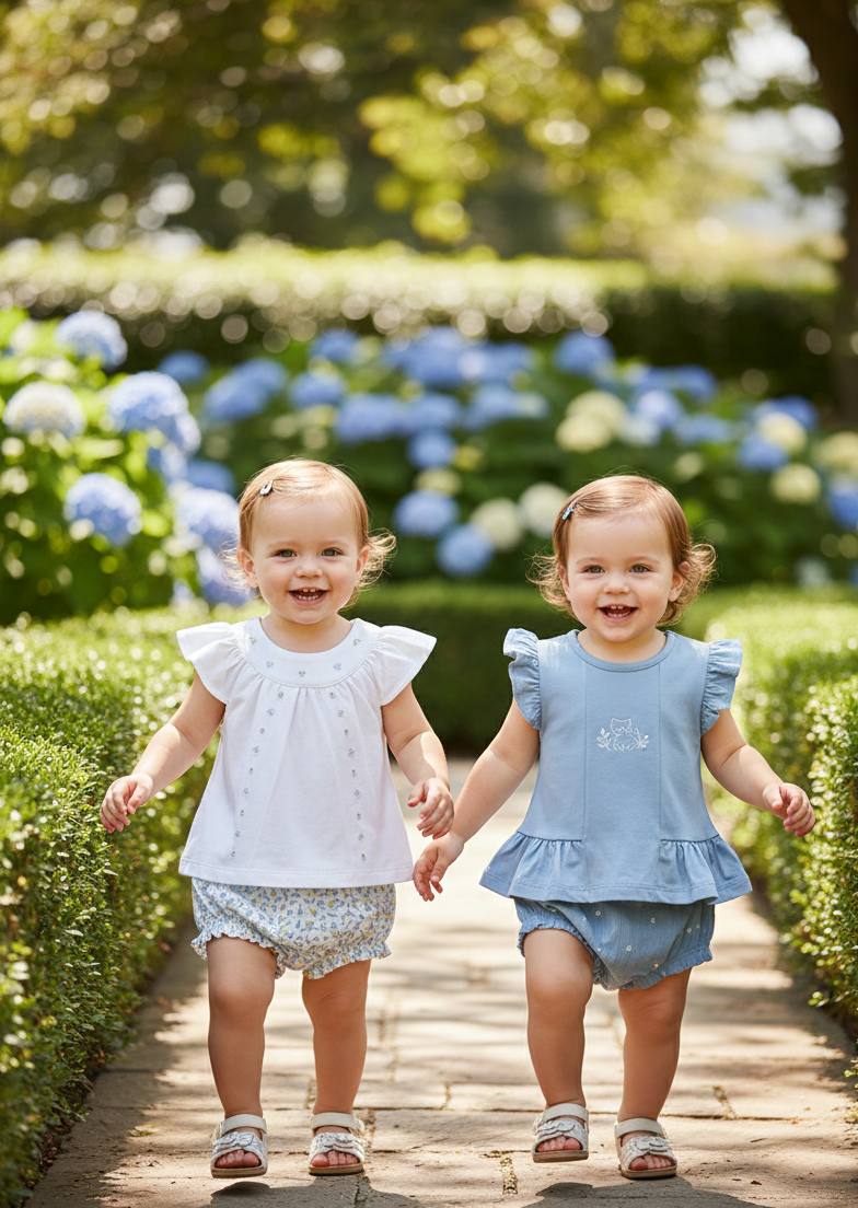 Es un conjunto de estilo europeo tradicional. La combinación del blanco con el azul celeste evoca frescura y limpieza. Es una prenda versátil: suficientemente cómoda para jugar, pero con detalles lo bastante cuidados para un evento o una sesión fotográfica.