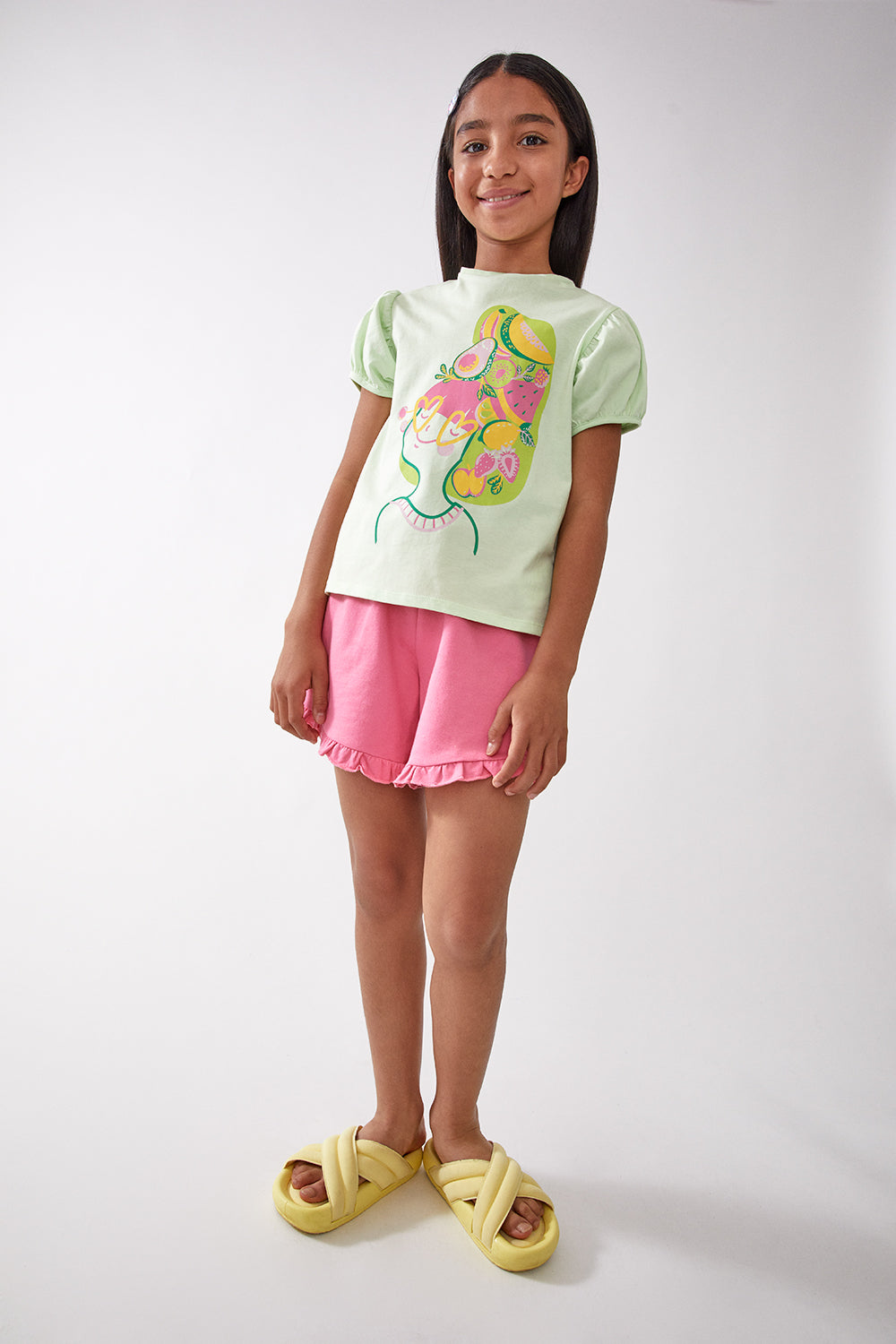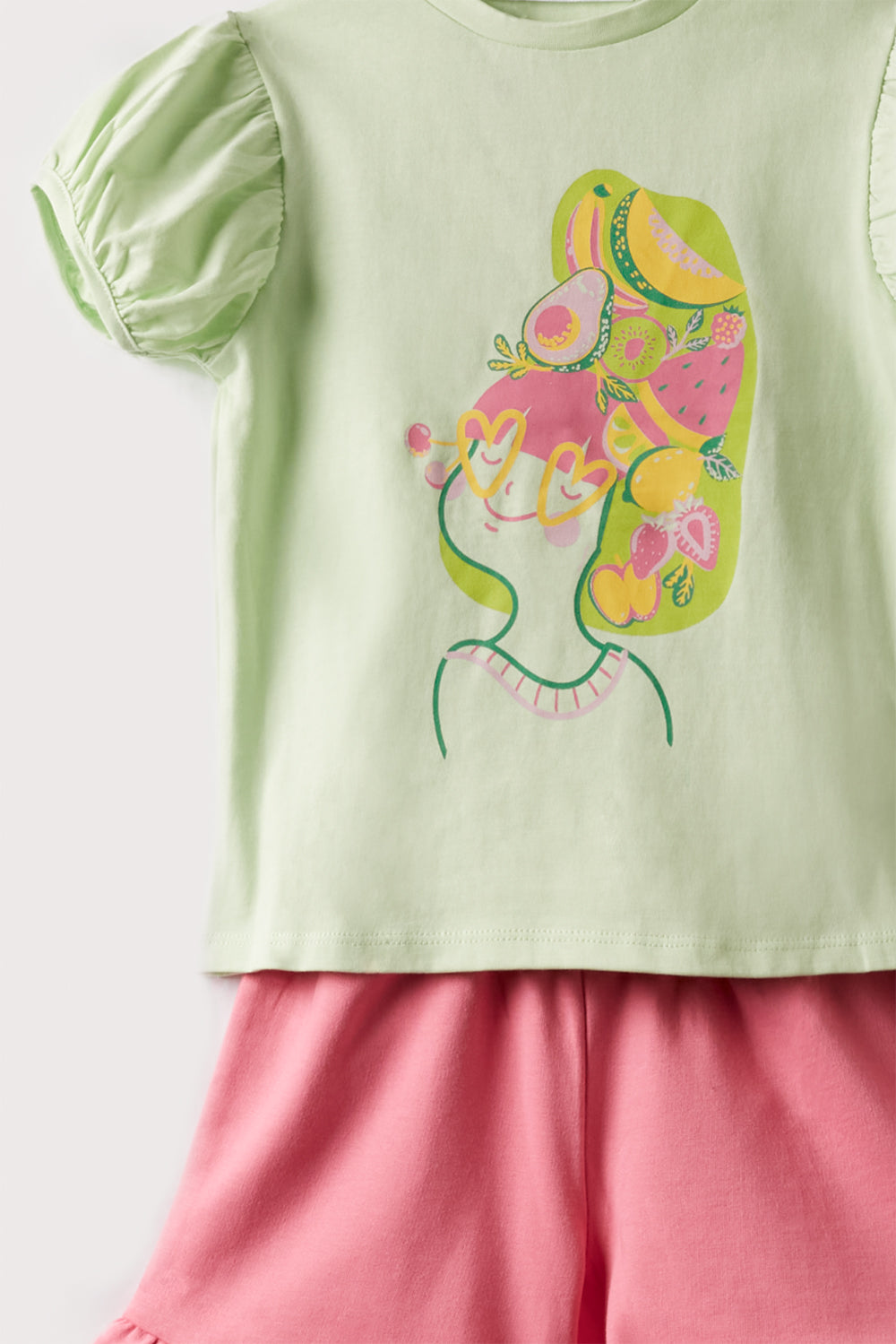 Conjunto short de color fucsia y camiseta verde claro, para bebe y niñaNo se pudo cargar la disponibilidad de retiro